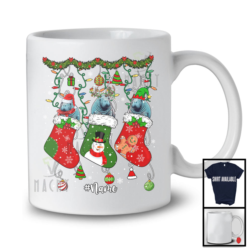 Personalized Three Santa Elf Manatee In Christmas Socks; Lovely Wild Animal Lover; Snowing T-Shirt