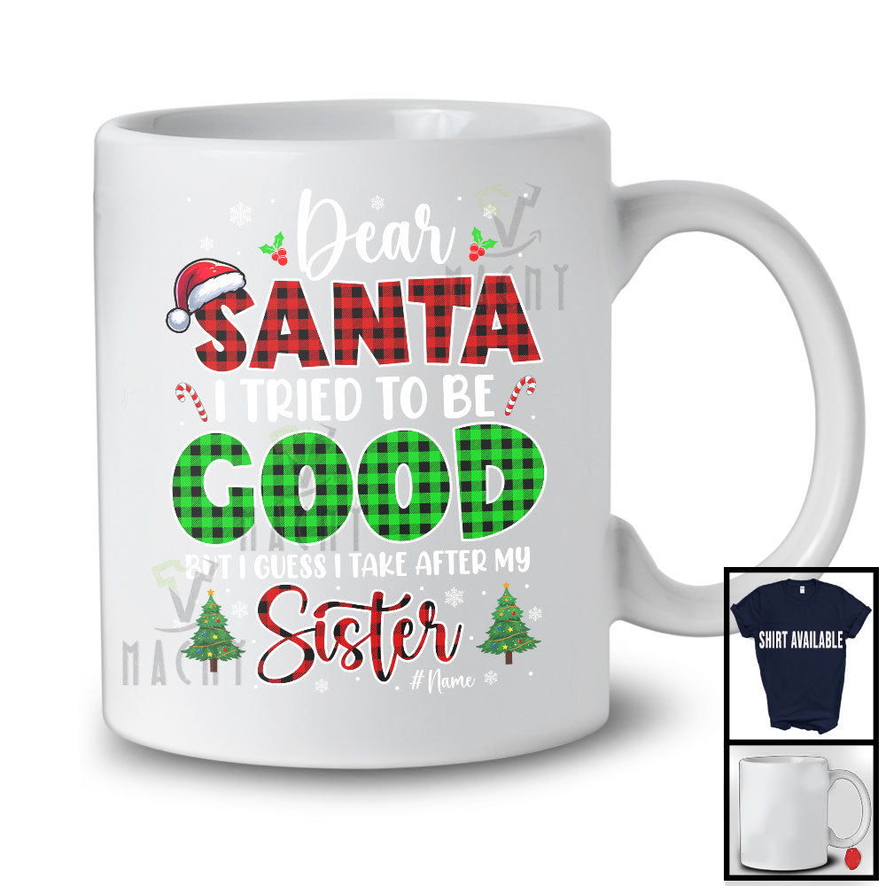 • Personalized Tried To Be Good Take After My Sister; Plaid Christmas Santa; Custom Name Family T-Shirt. This cotton t-shirt is a durable staple product with a classic fit. One of the most popular items, it has a relaxed style made for everyday and casual wear.