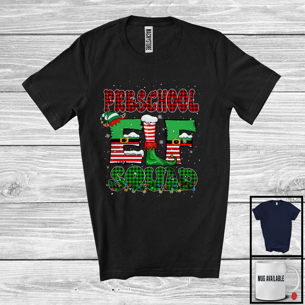 • Preschool Elf Squad; Awesome Christmas Lights Plaid Elf Lover; Students Teacher Group T-Shirt. This cotton t-shirt is a durable staple product with a classic fit. One of the most popular items, it has a relaxed style made for everyday and casual wear.