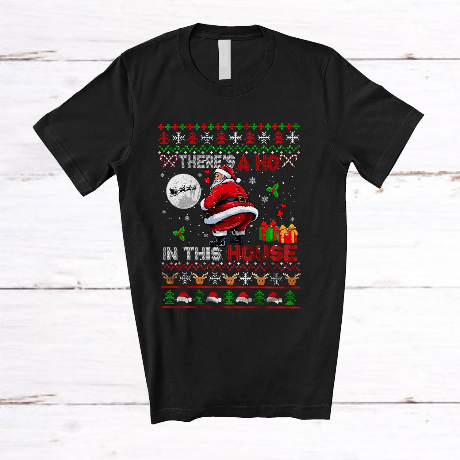 There's A Ho In This House; Sarcastic Christmas Sweater Naughty Santa; Pajamas Family Group T-Shirt. This cotton t-shirt is a durable staple product with a classic fit. One of the most popular items, it has a relaxed style made for everyday and casual wear.