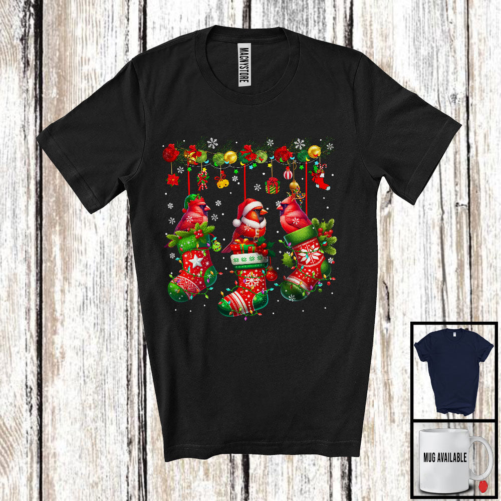 Three Elf Santa Reindeer Cardinal Birds In X-mas Socks; Lovely Christmas Bird Lover; Moon Snow T-Shirt