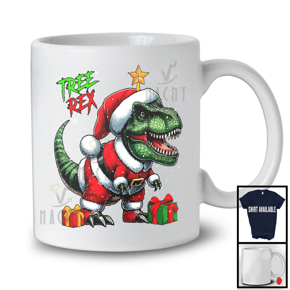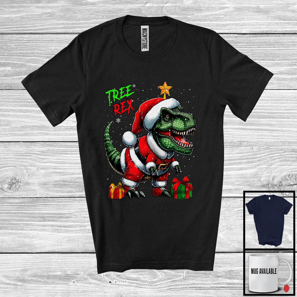 Tree Rex; Scary Christmas Santa T-Rex Dinosaur Santa; Snowing X-mas Family Group T-Shirt. This cotton t-shirt is a durable staple product with a classic fit. One of the most popular items, it has a relaxed style made for everyday and casual wear.