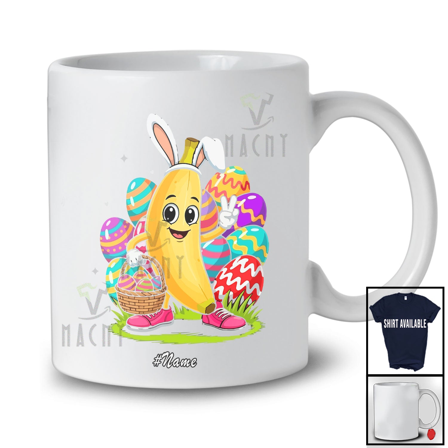 Personalized Custom Name Banana Bunny With Easter Eggs Basket; Lovely Easter Day Vegan Lover T-Shirt. This cotton t-shirt is a durable staple product with a classic fit. One of the most popular items, it has a relaxed style made for everyday and casual wear.