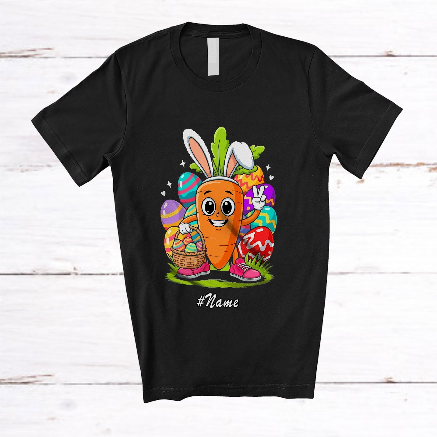 Personalized Custom Name Carrot Bunny With Easter Eggs Basket; Lovely Easter Day Vegan Lover T-Shirt. This cotton t-shirt is a durable staple product with a classic fit. One of the most popular items, it has a relaxed style made for everyday and casual wear.