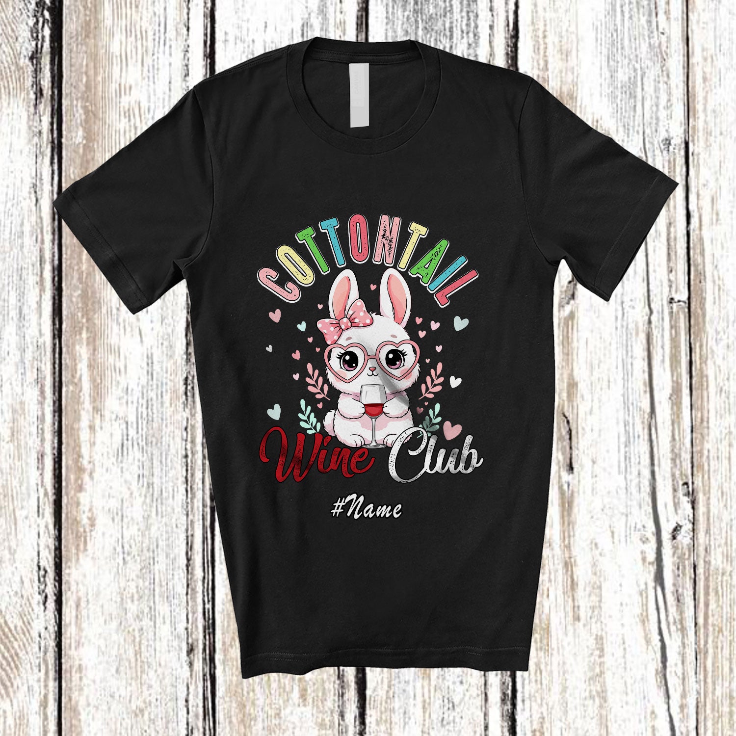 Personalized Custom Name Cottontail Wine; Adorable Easter Day Pink Bunny Glasses Drinking T-Shirt. This cotton t-shirt is a durable staple product with a classic fit. One of the most popular items, it has a relaxed style made for everyday and casual wear.
