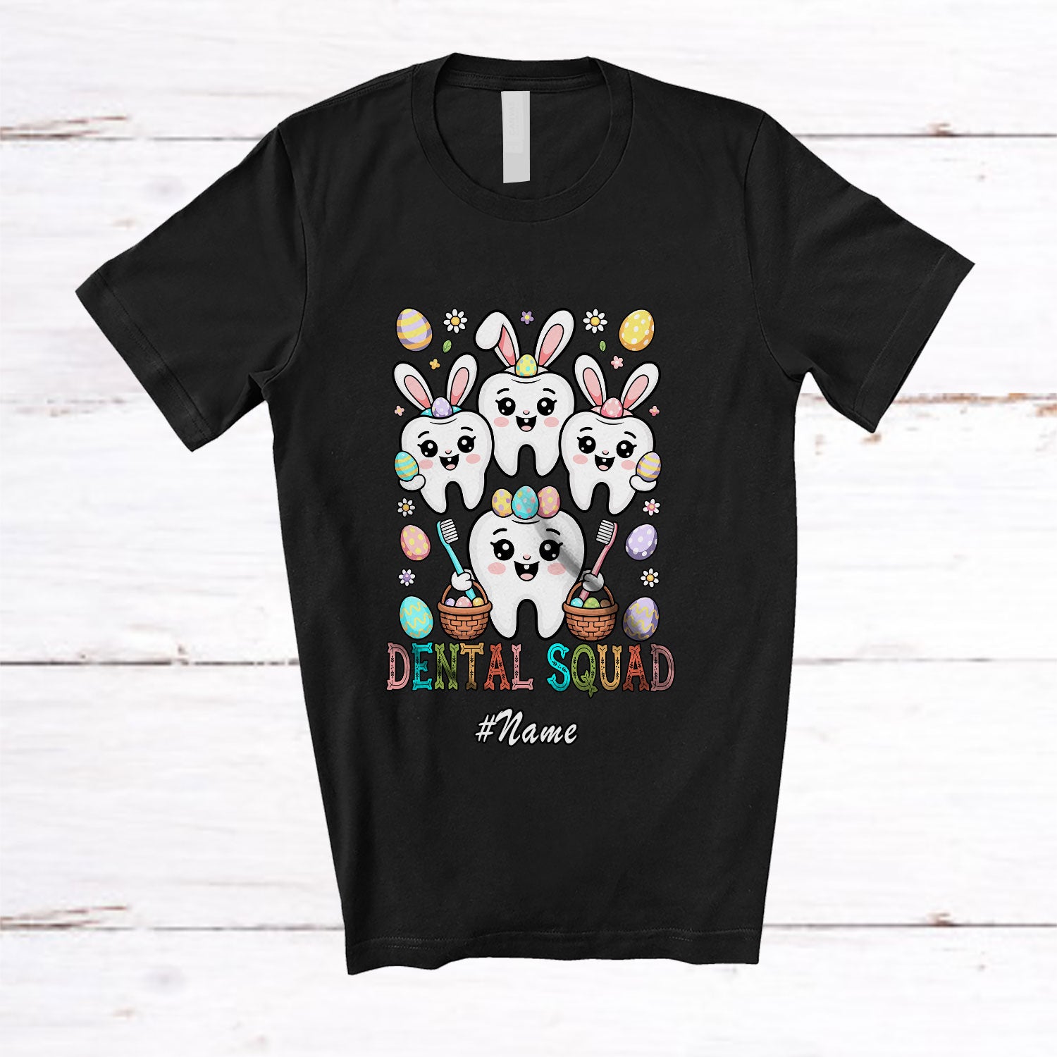 Personalized Custom Name Dental Squad; Lovely Easter Four Teeth Holding Easter Eggs; Dentist T-Shirt. This cotton t-shirt is a durable staple product with a classic fit. One of the most popular items, it has a relaxed style made for everyday and casual wear.