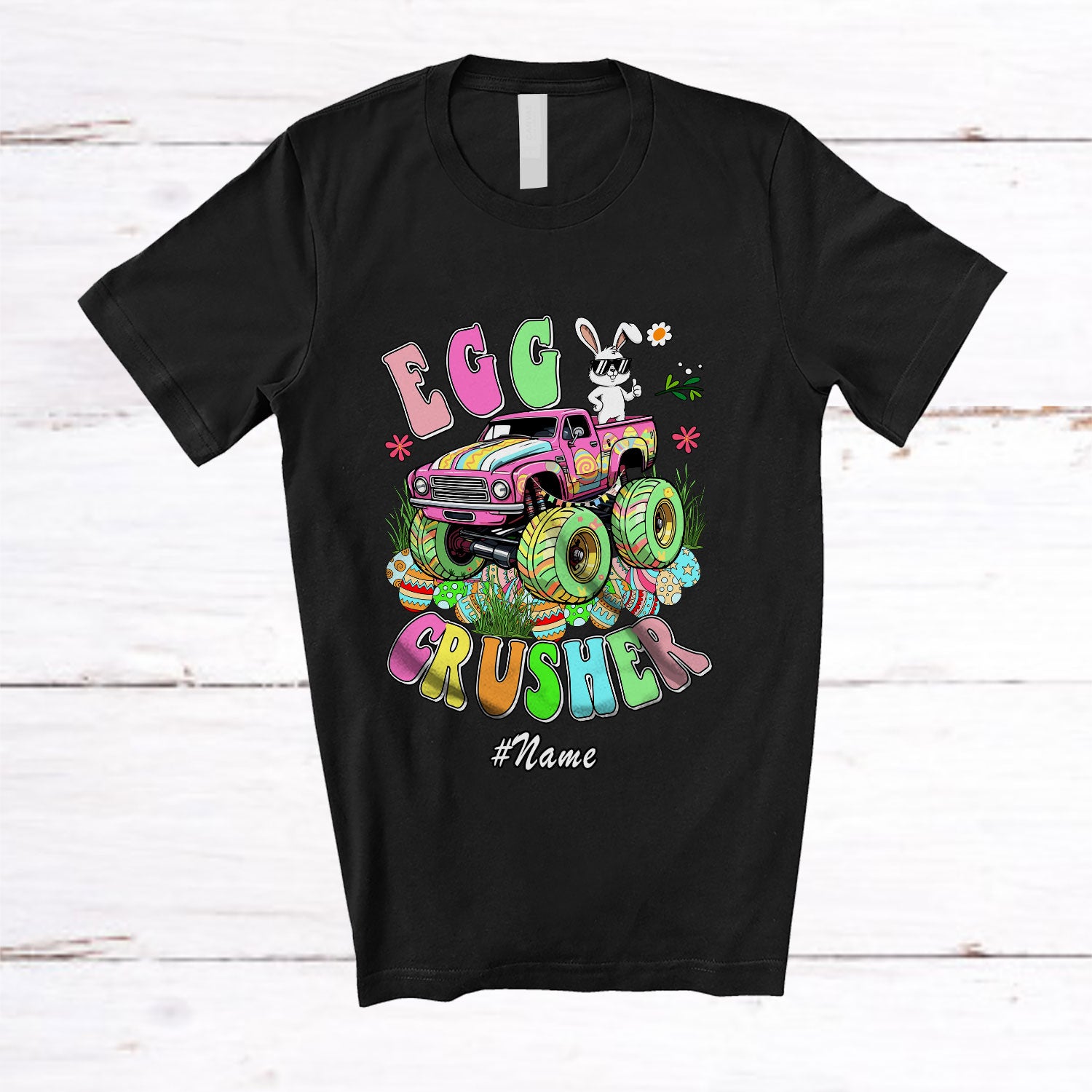 Personalized Custom Name Egg Crusher; Awesome Easter Bunny On Monster Truck; Eggs Hunting T-Shirt. This cotton t-shirt is a durable staple product with a classic fit. One of the most popular items, it has a relaxed style made for everyday and casual wear.