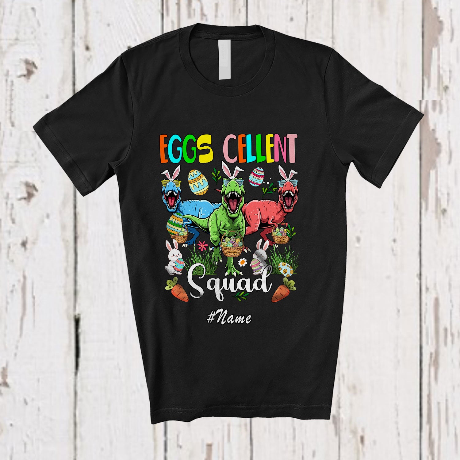 Personalized Custom Name Eggs Cellent Squad; Awesome Easter Excellent T-Rex Dinosaur Hunting Eggs T-Shirt. This cotton t-shirt is a durable staple product with a classic fit. One of the most popular items, it has a relaxed style made for everyday and casual wear.