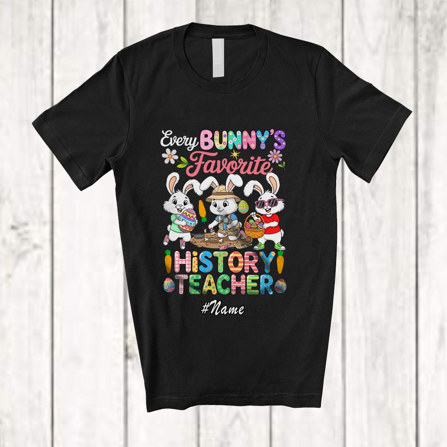 Personalized Custom Name Every Bunny's Favorite History Teacher; Joyful Easter Eggs Three Bunnies T-Shirt. This cotton t-shirt is a durable staple product with a classic fit. One of the most popular items, it has a relaxed style made for everyday and casual wear.