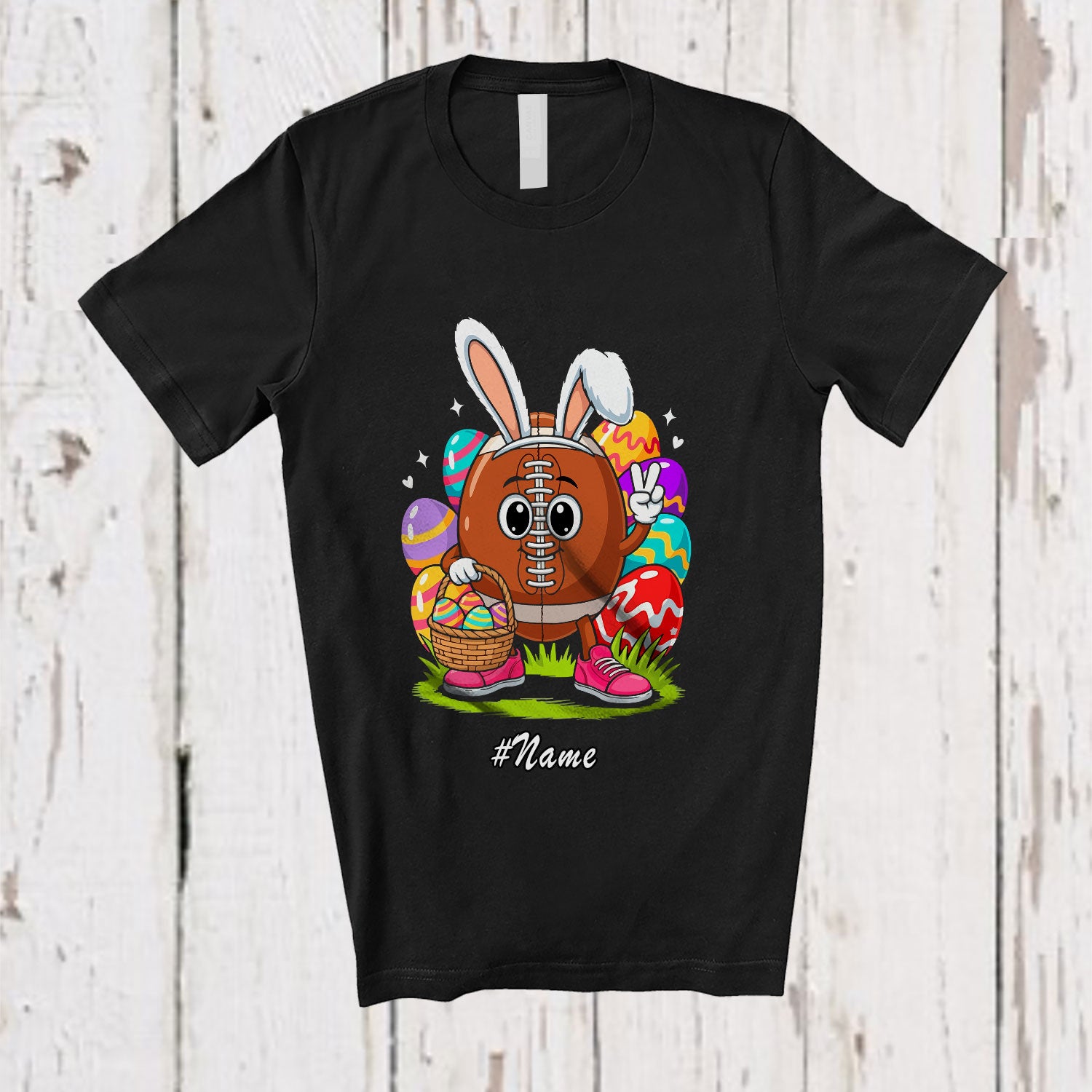 Personalized Custom Name Football Easter Bunny; Adorable Easter Day Eggs Football Player Team T-Shirt. This cotton t-shirt is a durable staple product with a classic fit. One of the most popular items, it has a relaxed style made for everyday and casual wear.