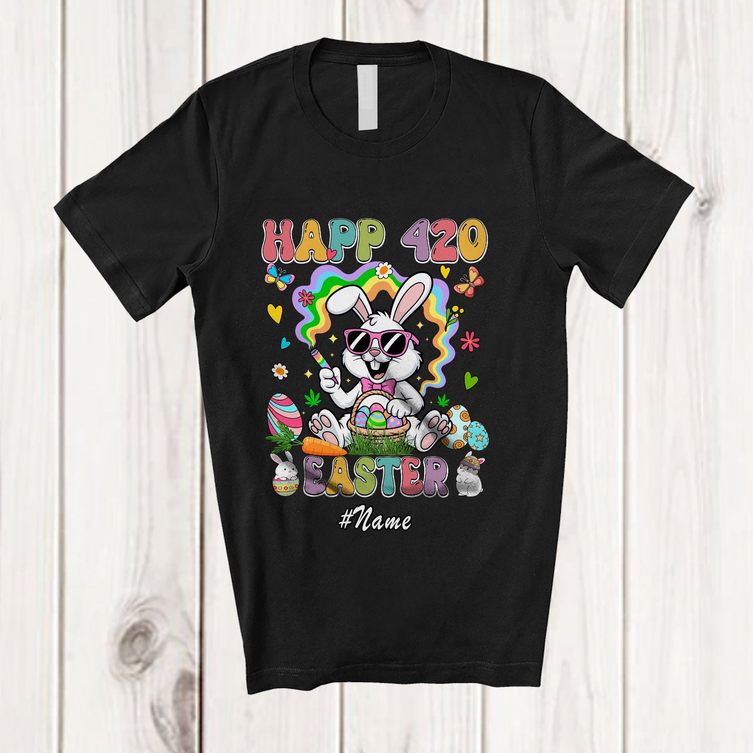 • Personalized Custom Name Happy 420 Easter; Humorous Easter Bunny Sunglasses Smoking Smoker T-Shirt. This cotton t-shirt is a durable staple product with a classic fit. One of the most popular items, it has a relaxed style made for everyday and casual wear.