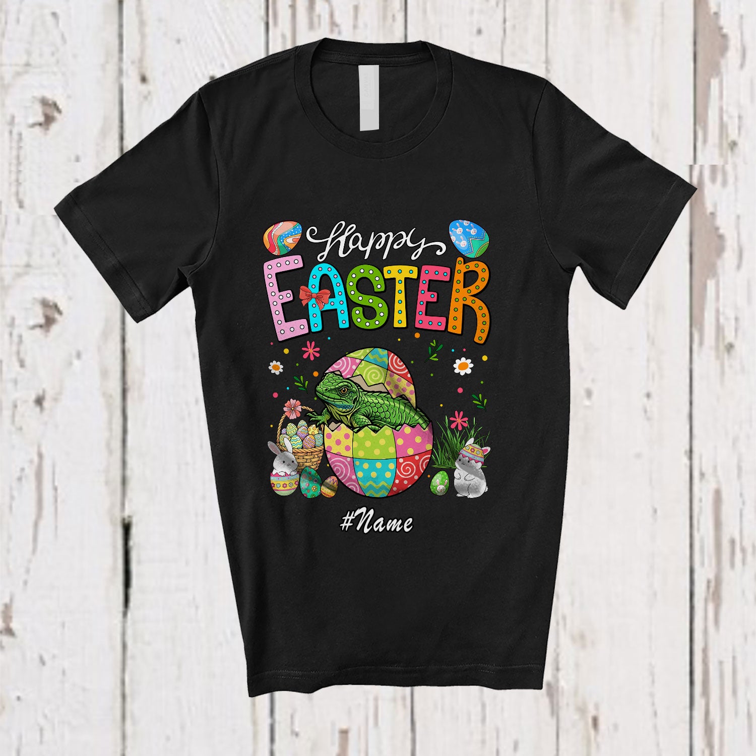 Personalized Custom Name Happy Easter; Adorable Lizard In Easter Egg; Eggs Hunting T-Shirt. This cotton t-shirt is a durable staple product with a classic fit. One of the most popular items, it has a relaxed style made for everyday and casual wear.