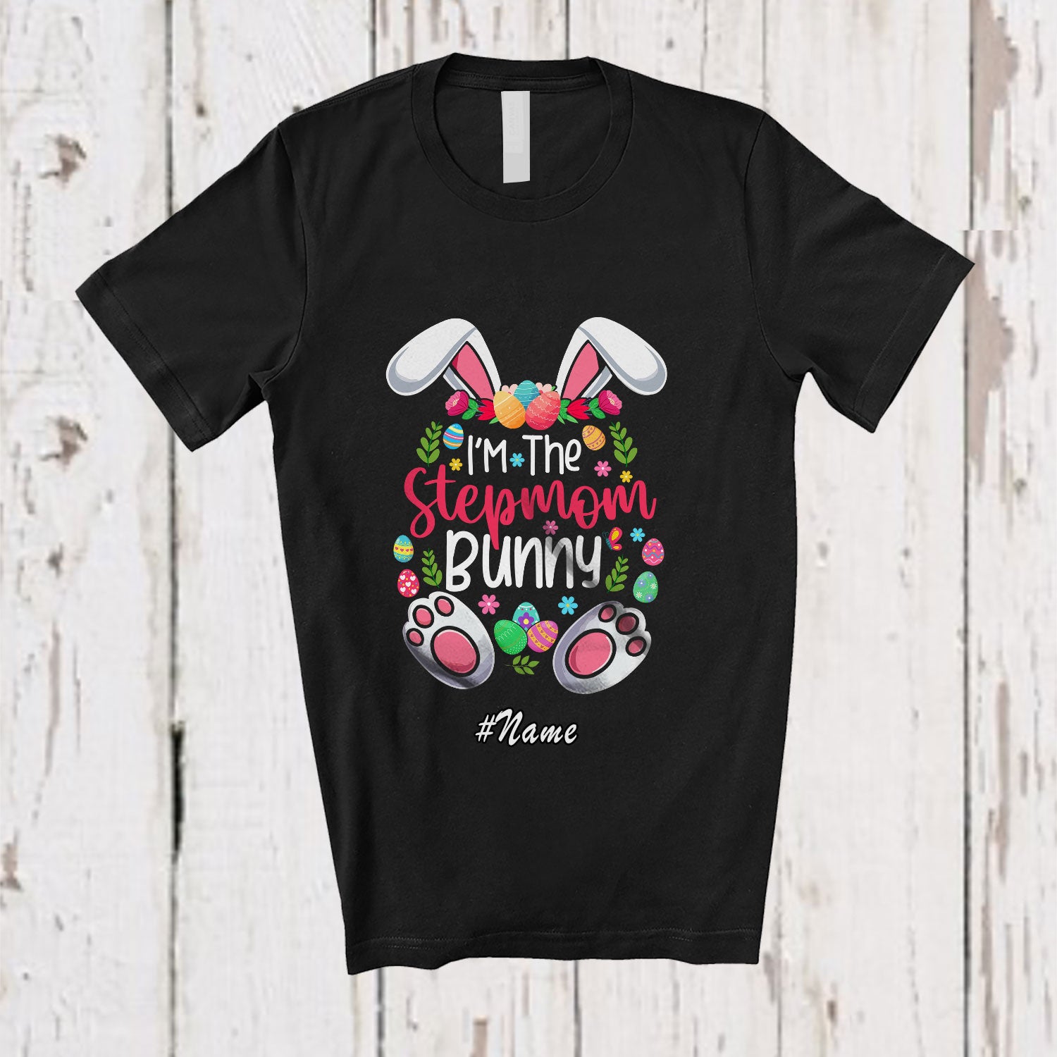 Personalized Custom Name I'm The Stepmom Bunny; Amazing Easter Bunny Flowers; Family Eggs Hunting T-Shirt. This cotton t-shirt is a durable staple product with a classic fit. One of the most popular items, it has a relaxed style made for everyday and casual wear.