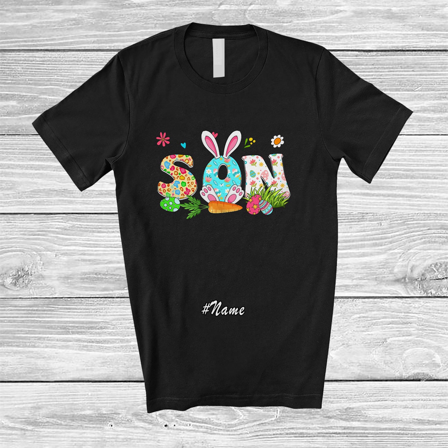 • Personalized Custom Name Son; Amazing Easter Day Bunny Flower Eggs Hunting Family Group T-Shirt. This cotton t-shirt is a durable staple product with a classic fit. One of the most popular items, it has a relaxed style made for everyday and casual wear.