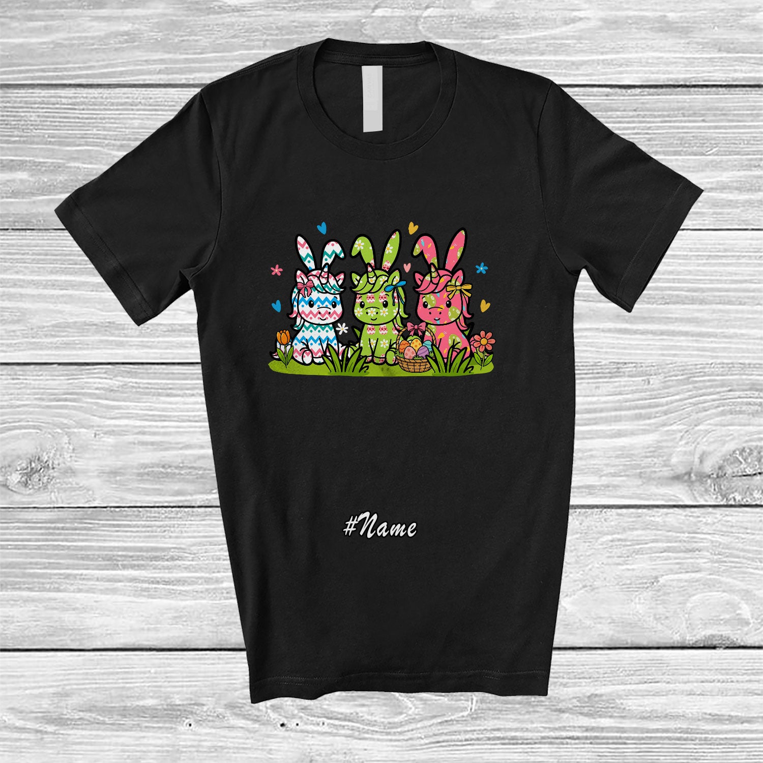 • Personalized Custom Name Three Flowers Unicorn Bunny; Lovely Easter Day Animal Eggs Hunting T-Shirt. This cotton t-shirt is a durable staple product with a classic fit. One of the most popular items, it has a relaxed style made for everyday and casual wear.