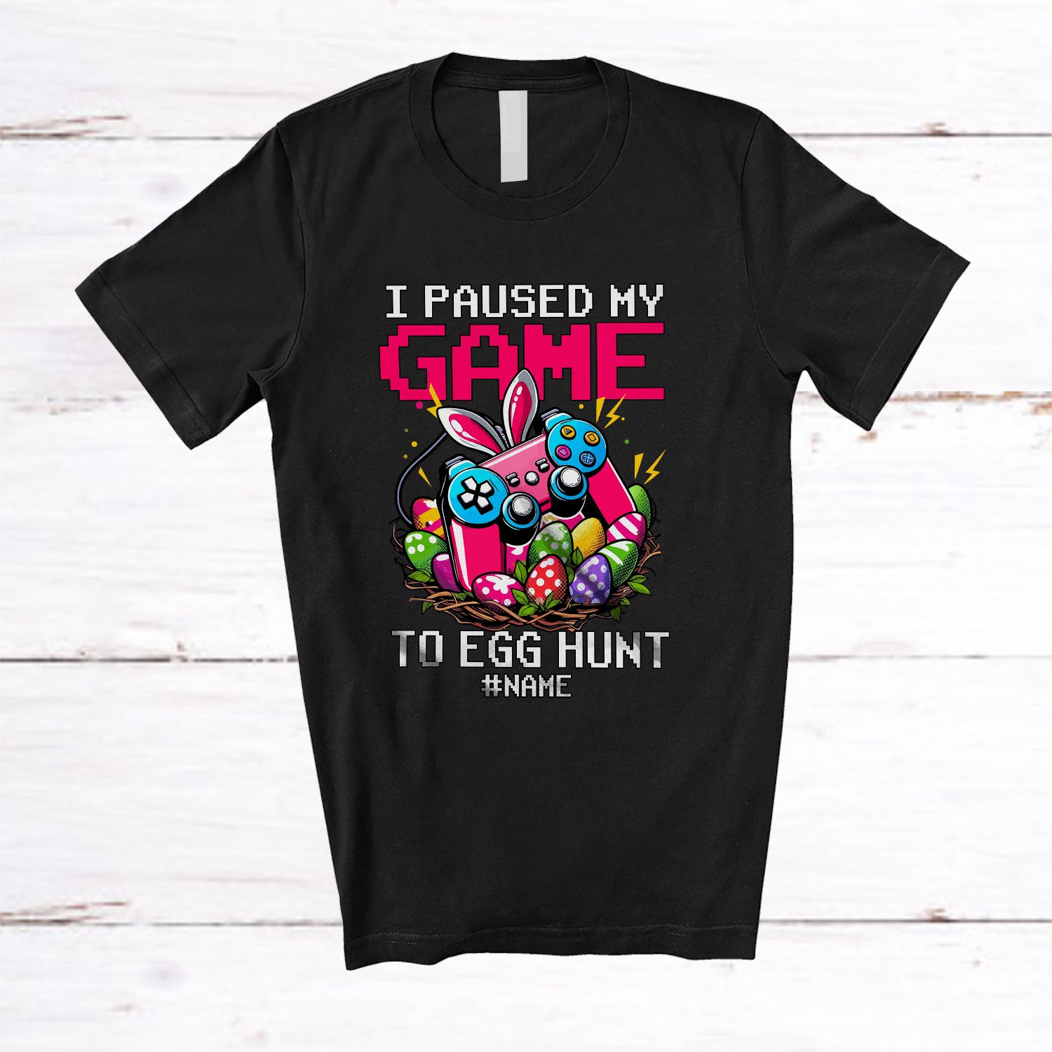 Personalized I Paused My Game To Egg Hunt; Colorful Easter Bunny Gaming; Custom Name Gamer T-Shirt. This cotton t-shirt is a durable staple product with a classic fit. One of the most popular items, it has a relaxed style made for everyday and casual wear.