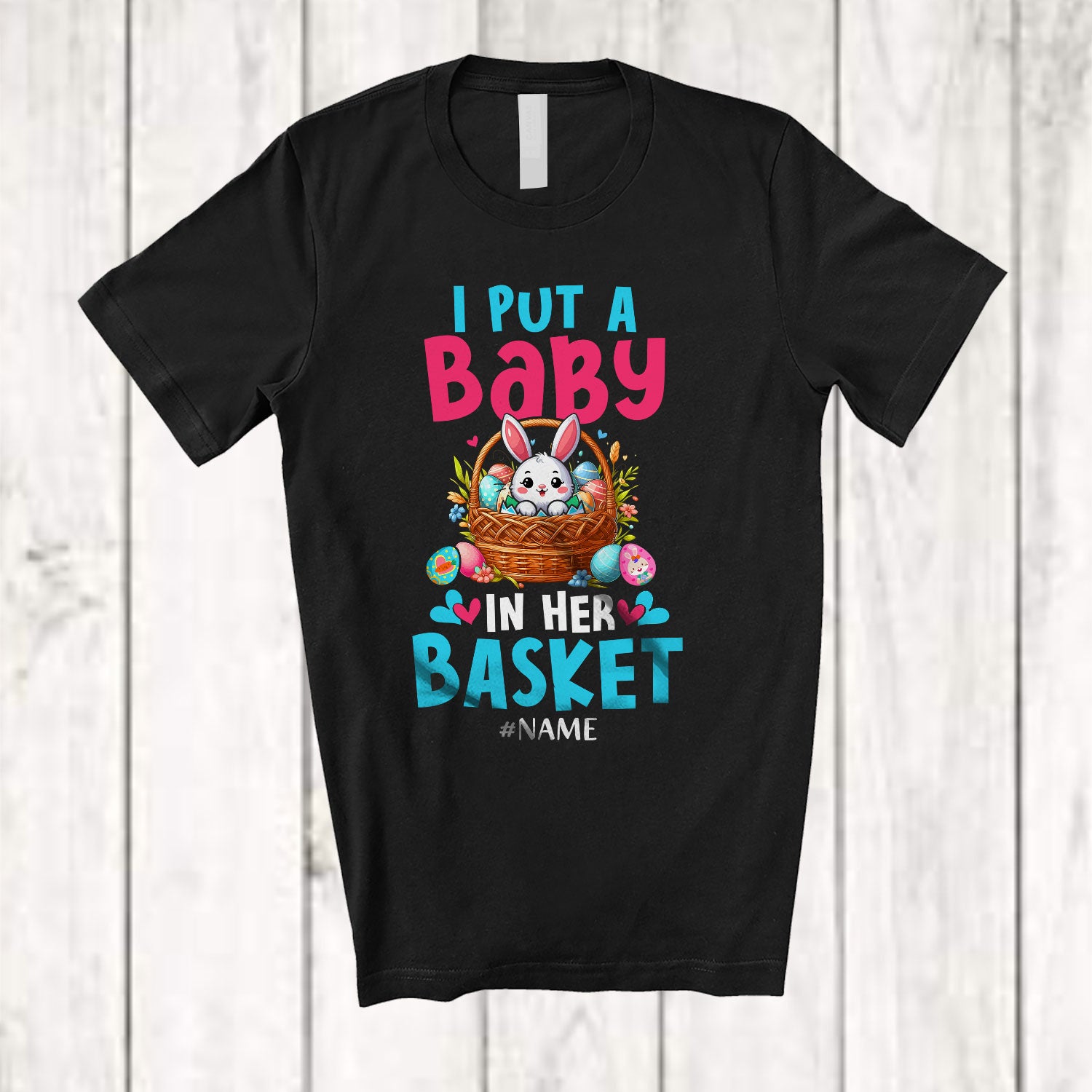 Personalized I Put A Baby In Her Basket; Lovely Pregnancy Easter Custom Name Bunny In Egg Basket T-Shirt