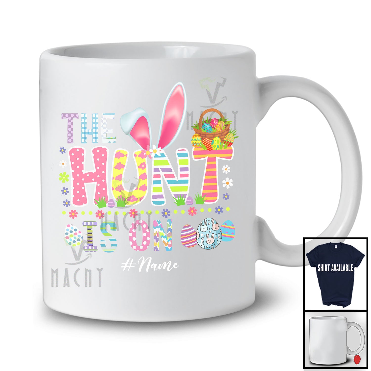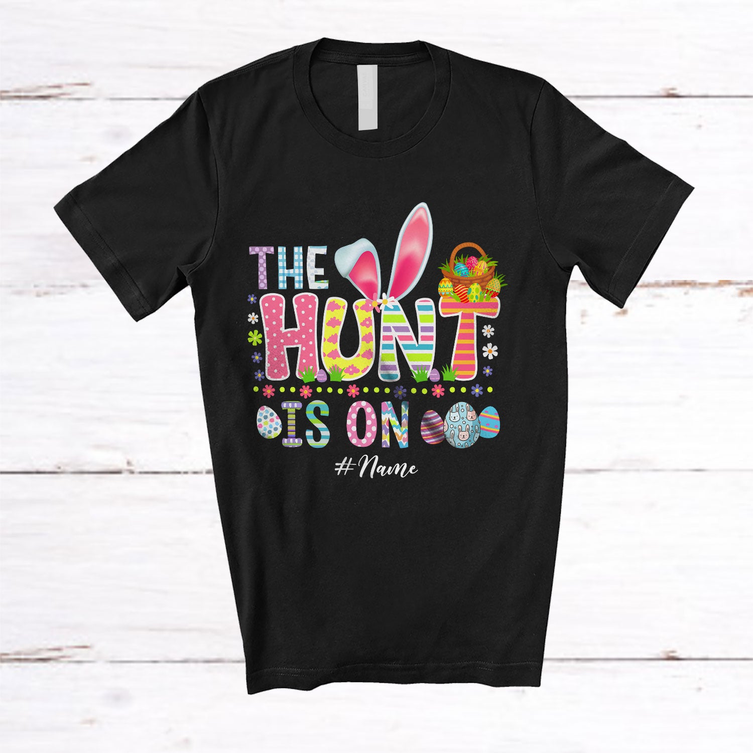 • Personalized The Hunt Is On; Awesome Easter Custom Name Bunny Eggs Hunting; Flowers Family T-Shirt. This cotton t-shirt is a durable staple product with a classic fit. One of the most popular items, it has a relaxed style made for everyday and casual wear.
