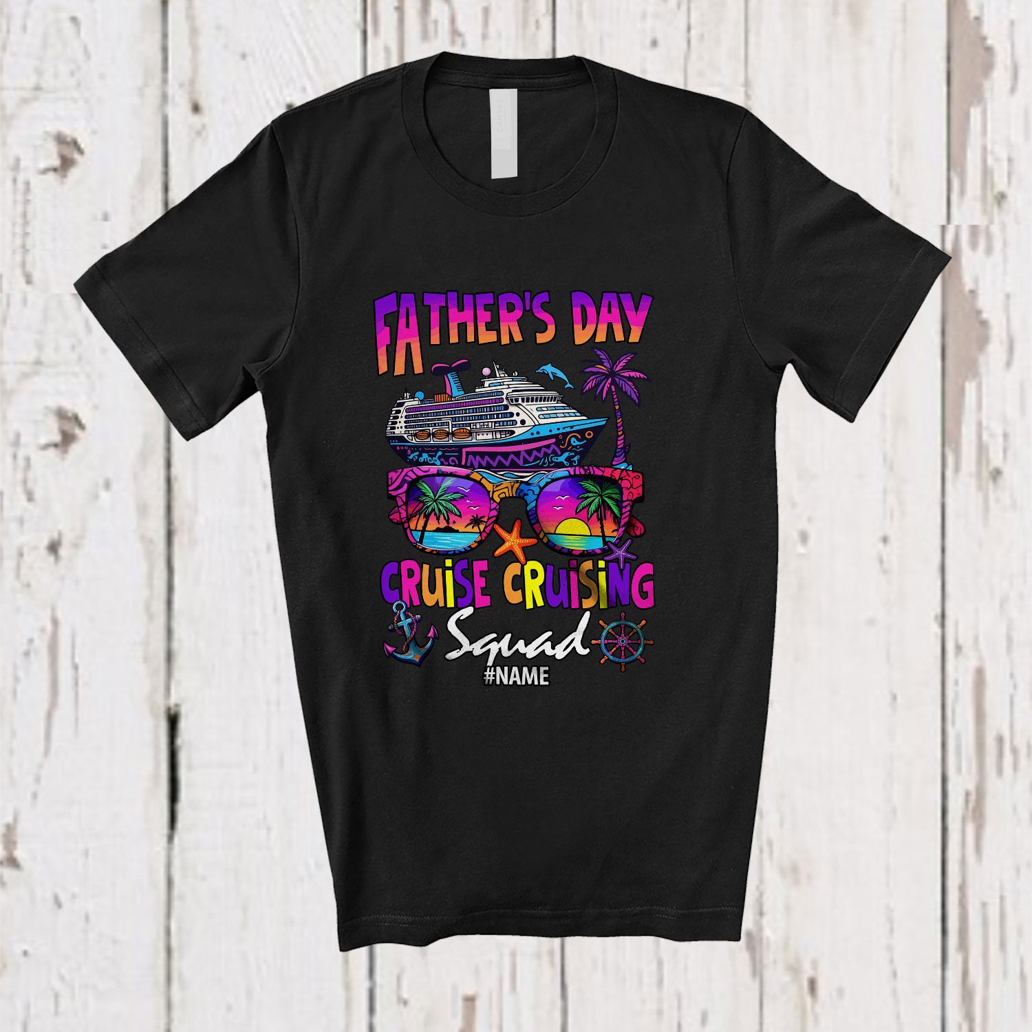 Personalized Custom Name Father's Day Cruise Cruising Squad; Joyful Summer Birthday Sunglasses T-Shirt. This cotton t-shirt is a durable staple product with a classic fit. One of the most popular items, it has a relaxed style made for everyday and casual wear.