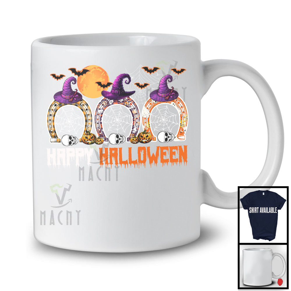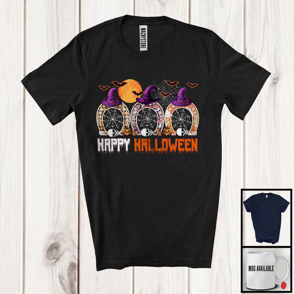 Happy Halloween, Scary Halloween Costume Three Witch Horseshoes, Skulls Pumpkins T-Shirt
