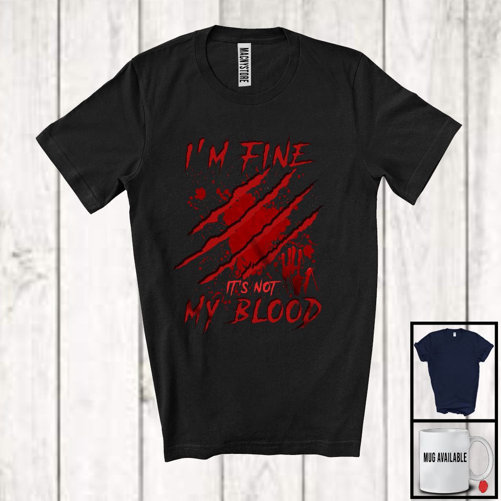 I'm Fine It's Not My Blood; Creepy Halloween Costume Blood; Matching Family Group T-Shirt. This cotton t-shirt is a durable staple product with a classic fit. One of the most popular items, it has a relaxed style made for everyday and casual wear.