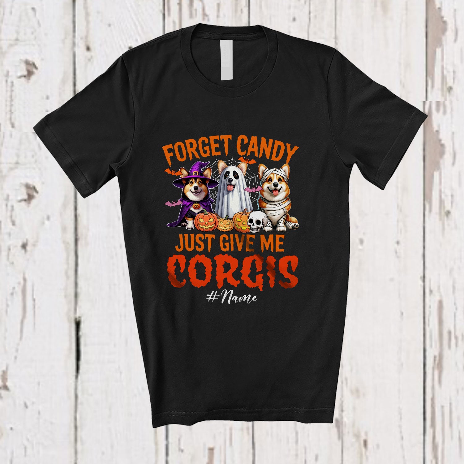 Personalized Custom Name Forget Candy Give Me Corgis; Lovely Halloween Three Corgis Boo Witch T-Shirt. This cotton t-shirt is a durable staple product with a classic fit. One of the most popular items, it has a relaxed style made for everyday and casual wear.