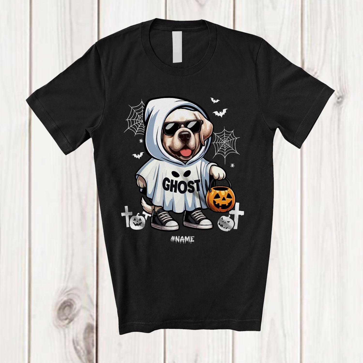 • Personalized Custom Name Labrador Retriever Boo Ghost Cosplay; Lovely Halloween Animal Sunglasses T-Shirt. This cotton t-shirt is a durable staple product with a classic fit. One of the most popular items, it has a relaxed style made for everyday and casual wear.
