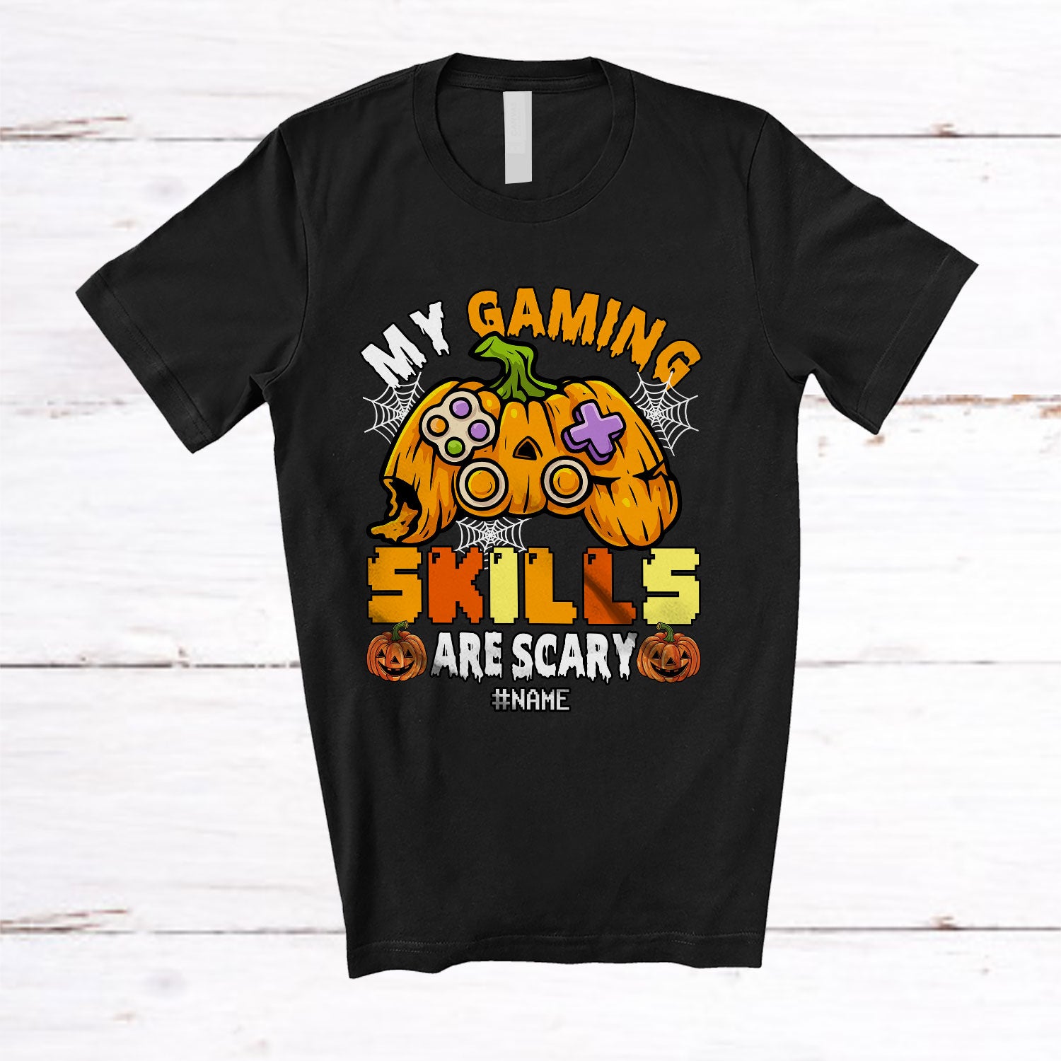 Personalized Custom Name My Gaming Skills Are Scary; Joyful Halloween Controller Pumpkin; Gamer T-Shirt. This cotton t-shirt is a durable staple product with a classic fit. One of the most popular items, it has a relaxed style made for everyday and casual wear.