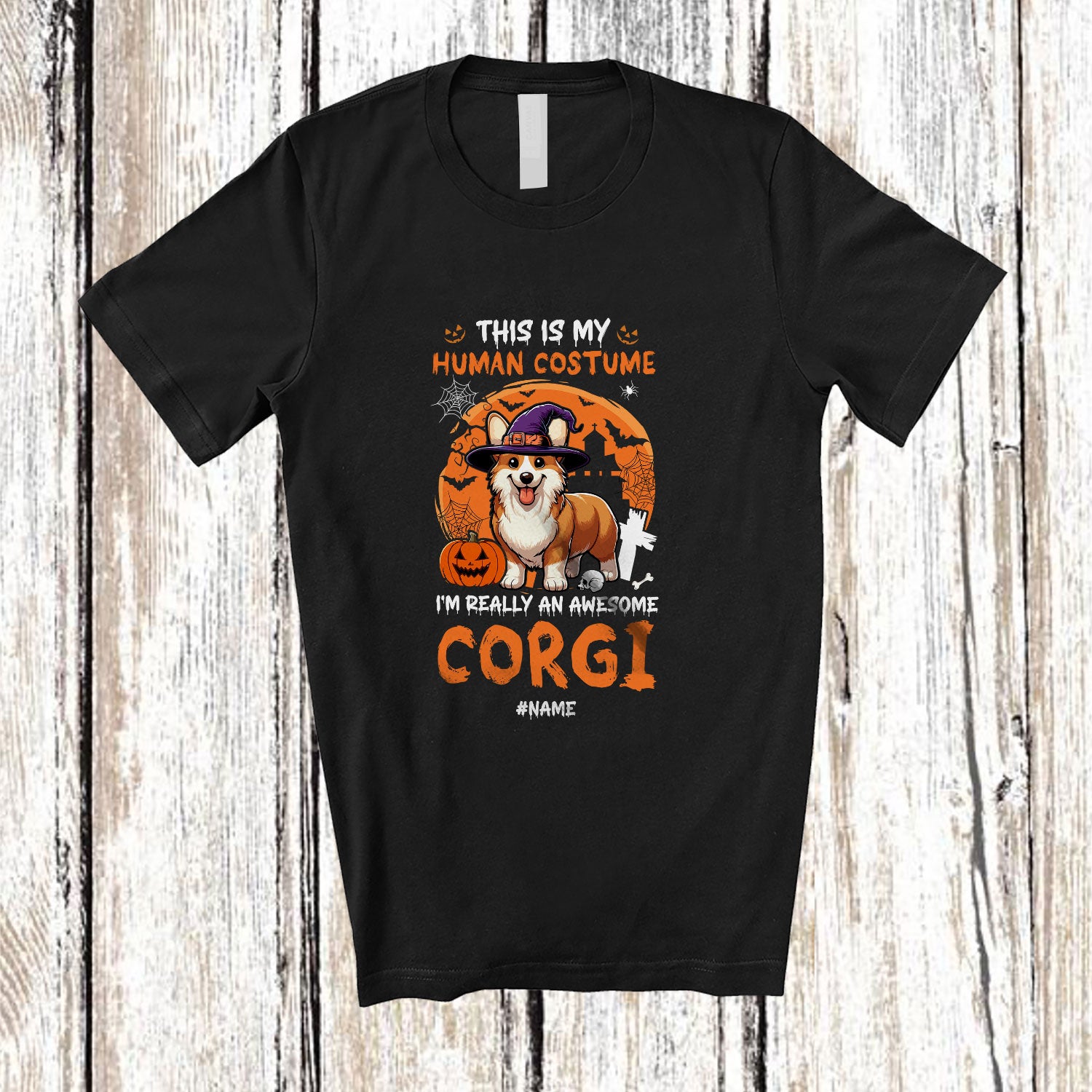Personalized Custom Name My Human Costume Corgi; Creepy Halloween Moon Animal Witch T-Shirt. This cotton t-shirt is a durable staple product with a classic fit. One of the most popular items, it has a relaxed style made for everyday and casual wear.