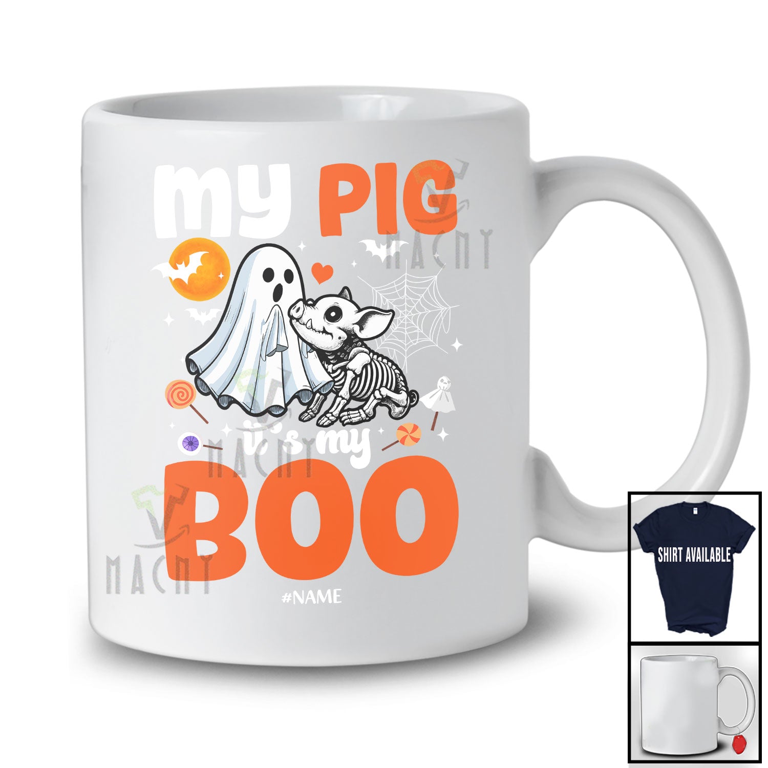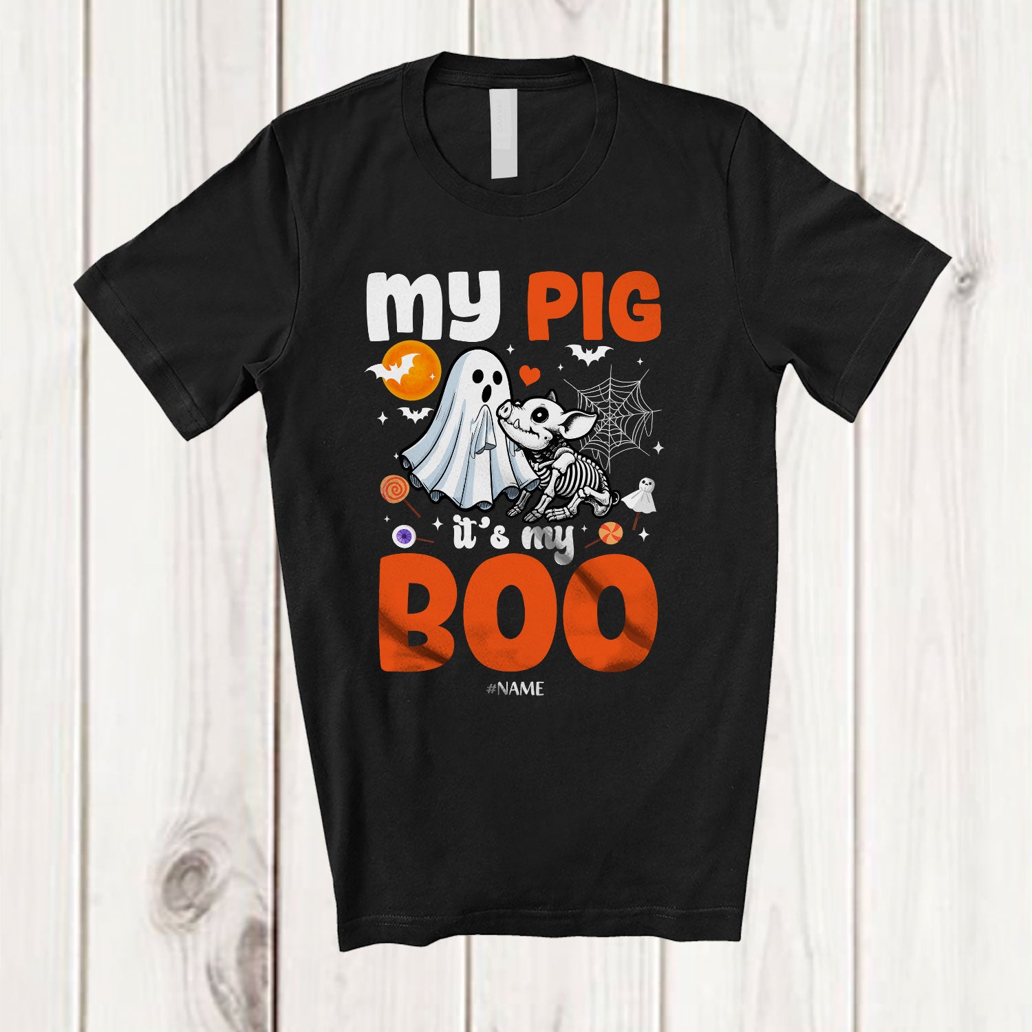 • Personalized Custom Name My Pig It's My Boo; Humorous Halloween Pig Ghost Skeleton T-Shirt. This cotton t-shirt is a durable staple product with a classic fit. One of the most popular items, it has a relaxed style made for everyday and casual wear.