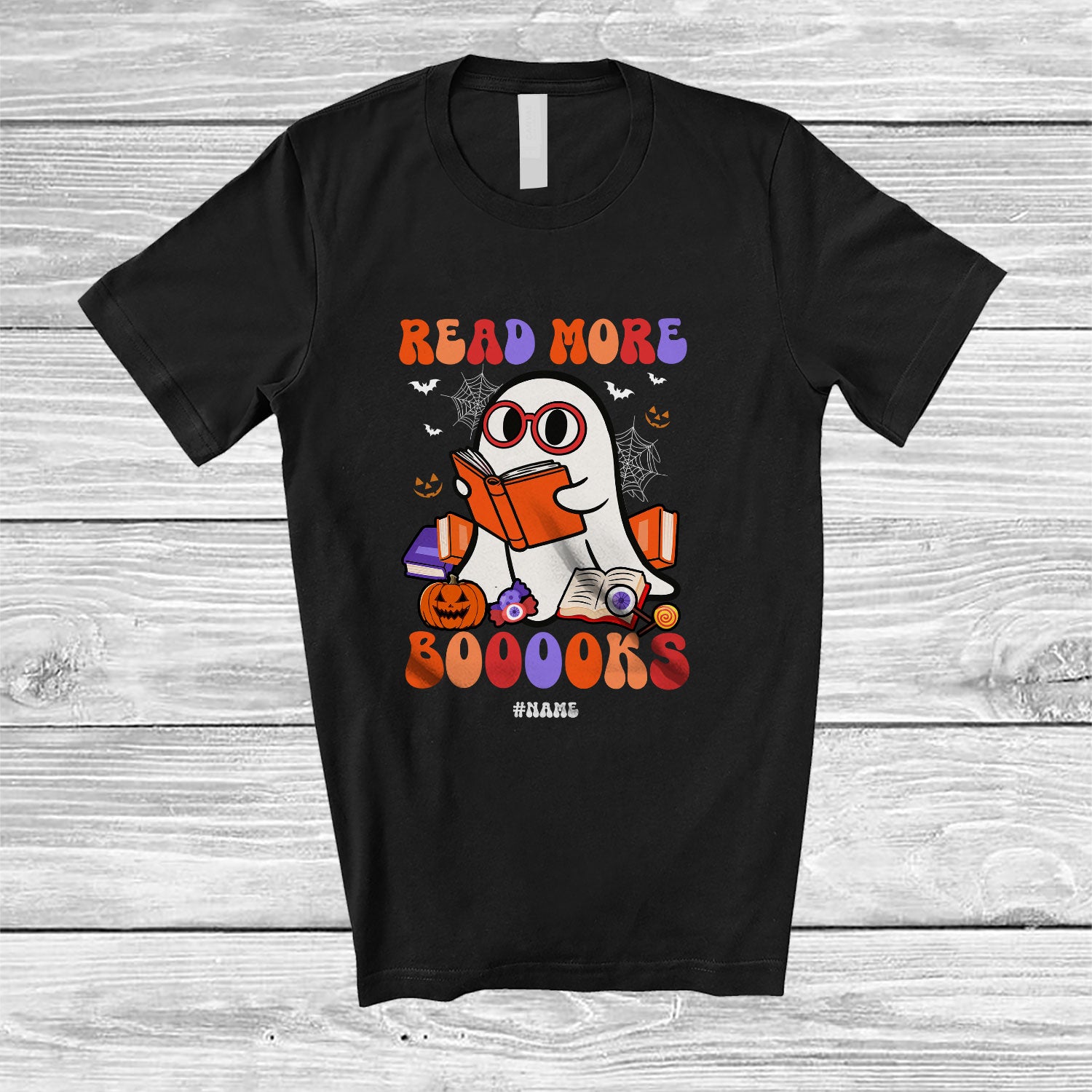 Personalized Custom Name Read More Booooks; Humorous Halloween Boo Ghost Books Teacher T-Shirt. This cotton t-shirt is a durable staple product with a classic fit. One of the most popular items, it has a relaxed style made for everyday and casual wear.