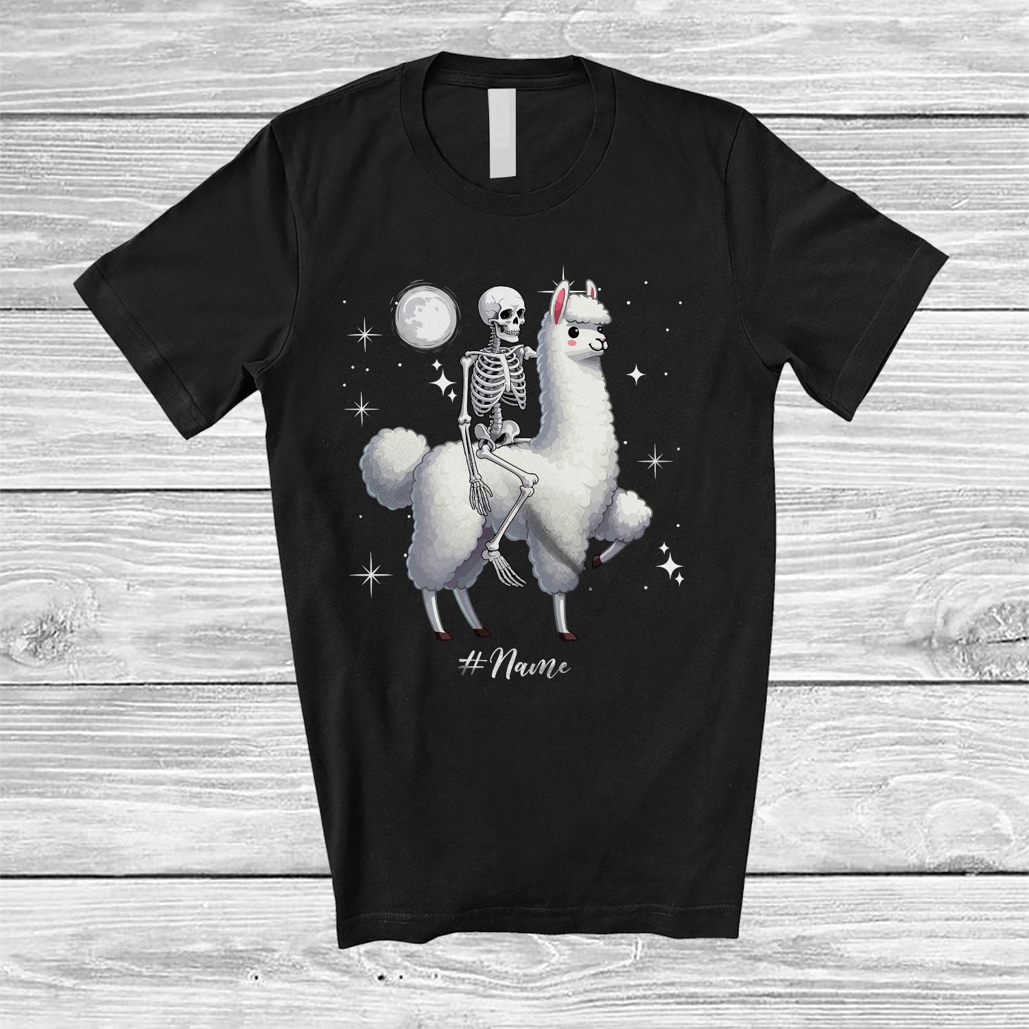 Personalized Custom Name Skeleton Riding Llama; Humorous Halloween Skeleton Skull Animal T-Shirt