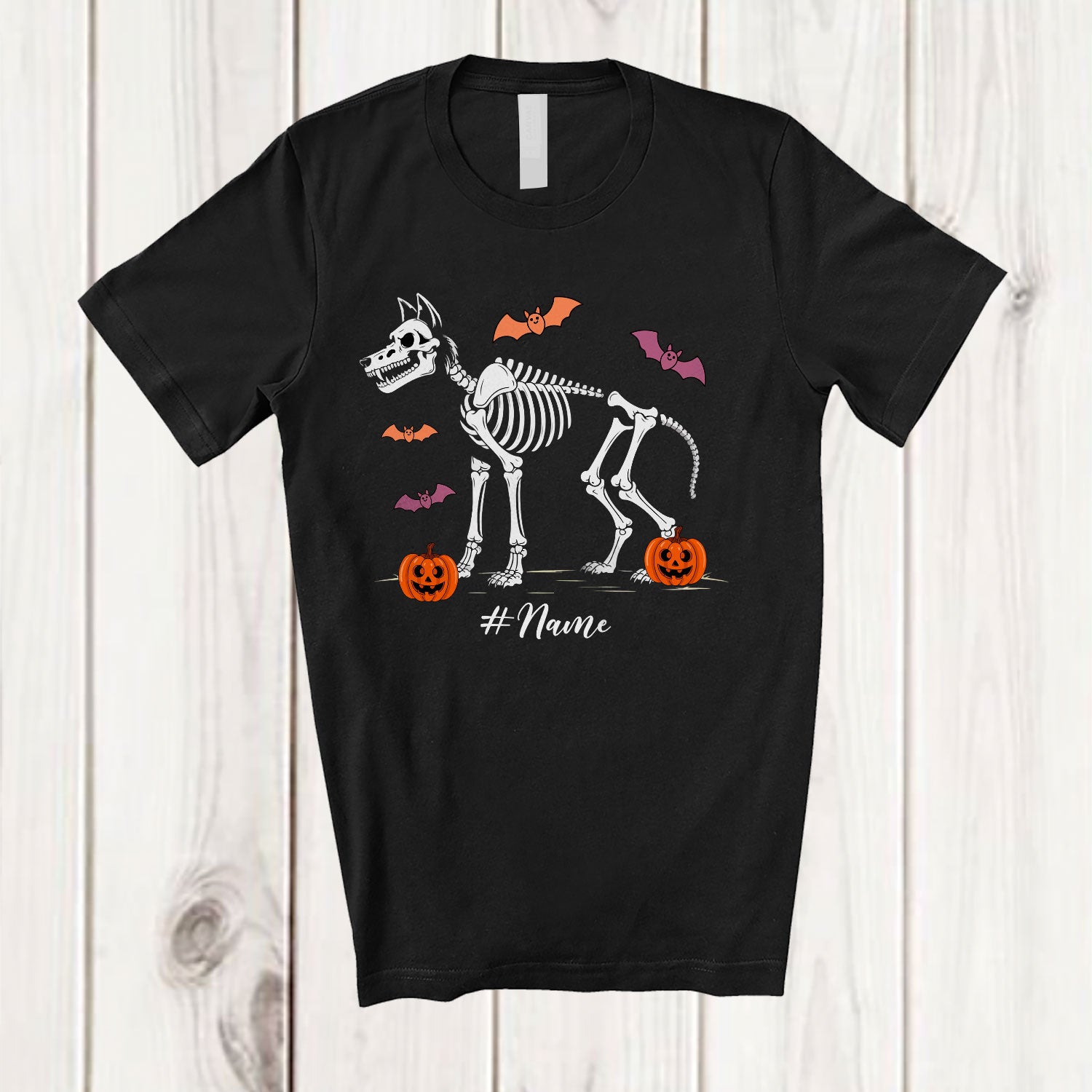 • Personalized Custom Name Skeleton Wolf; Creepy Halloween Pumpkin Candy; Boys Family T-Shirt. This cotton t-shirt is a durable staple product with a classic fit. One of the most popular items, it has a relaxed style made for everyday and casual wear.