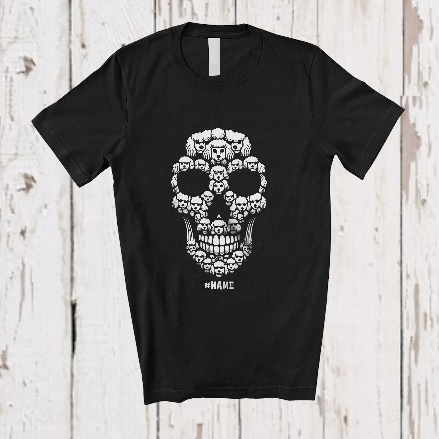 • Personalized Custom Name Skull Shape Poodle Owner; Creepy Halloween Family T-Shirt. This cotton t-shirt is a durable staple product with a classic fit. One of the most popular items, it has a relaxed style made for everyday and casual wear.