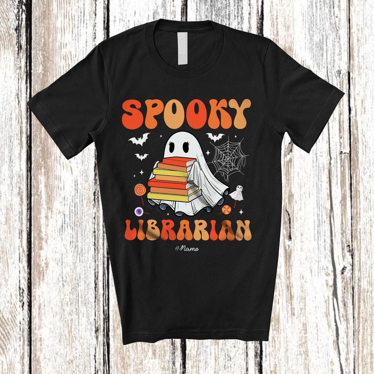 Personalized Custom Name Spooky Librarian; Lovely Halloween Boo Ghost Books; Family T-Shirt. This cotton t-shirt is a durable staple product with a classic fit. One of the most popular items, it has a relaxed style made for everyday and casual wear.