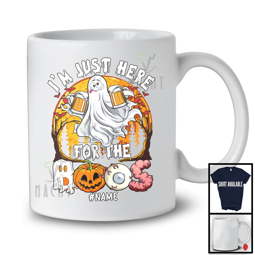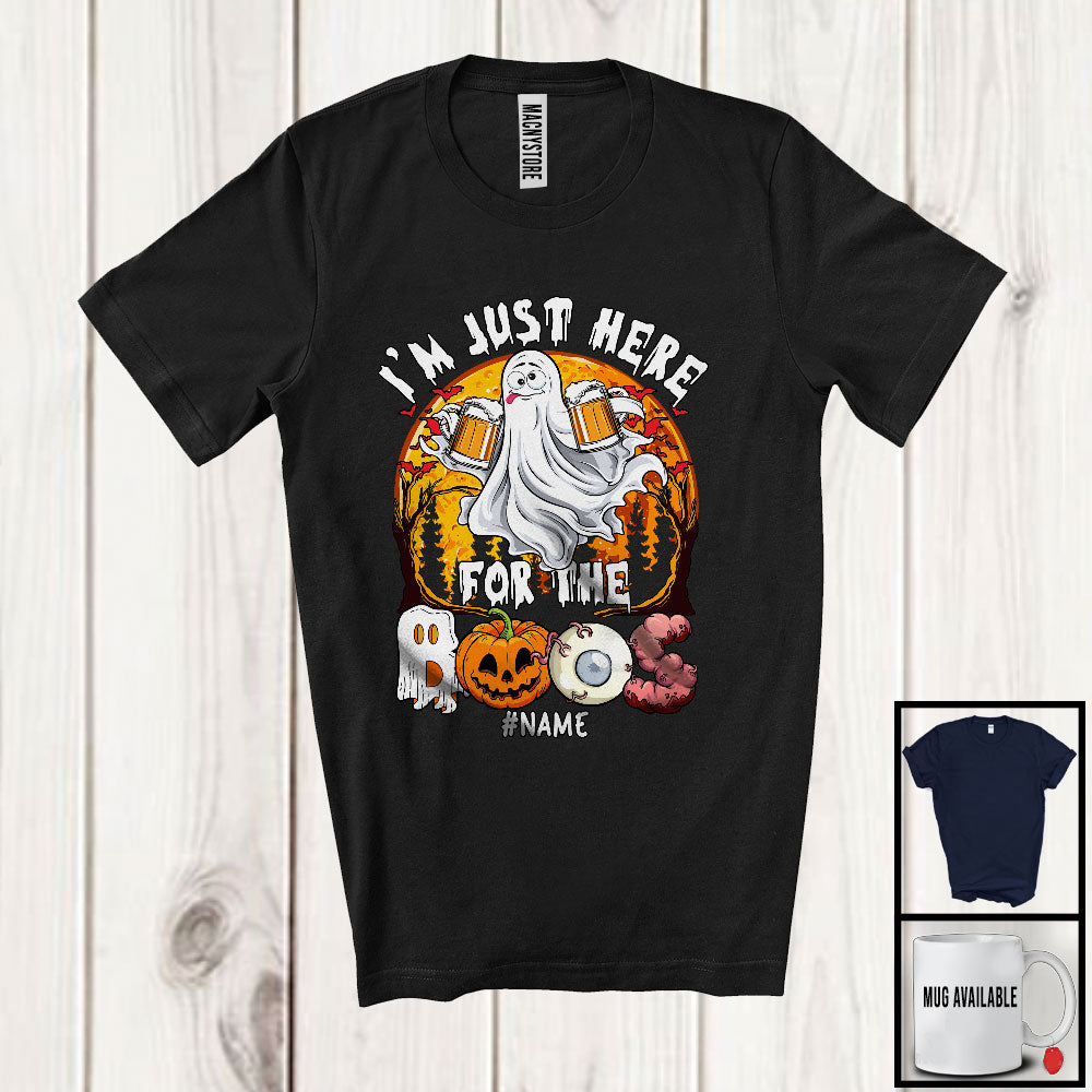 • Personalized I'm Just Here For The Boos, Horror Halloween Moon Custom Name Boo Ghost, Drinking Beer T-Shirt. This cotton t-shirt is a durable staple product with a classic fit. One of the most popular items, it has a relaxed style made for everyday and casual wear.