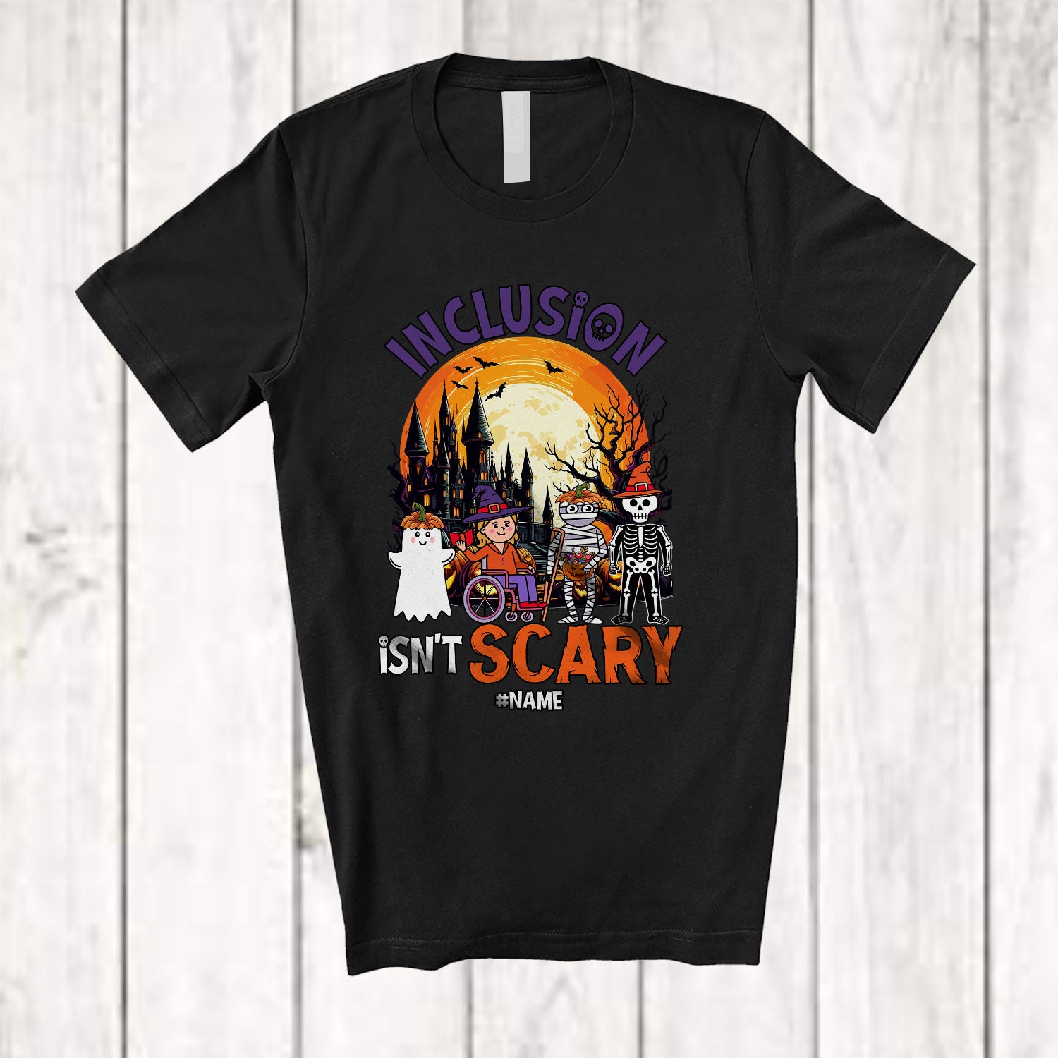 Personalized Inclusion Isn't Scary; Creepy Halloween Moon Custom Name SLP Sped Teacher T-Shirt