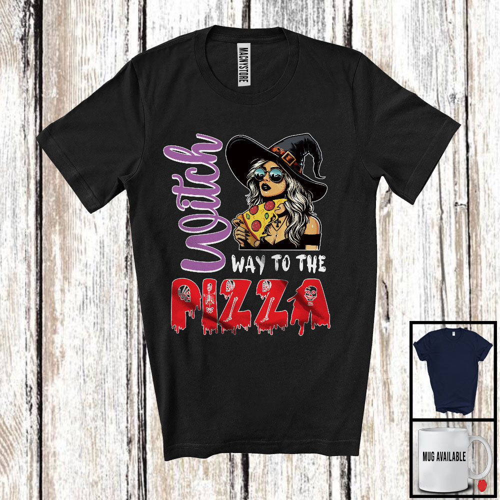• Witch Way To The Pizza; Sarcastic Halloween Witch Sunglasses; Eating Pizza T-Shirt. This cotton t-shirt is a durable staple product with a classic fit. One of the most popular items, it has a relaxed style made for everyday and casual wear.