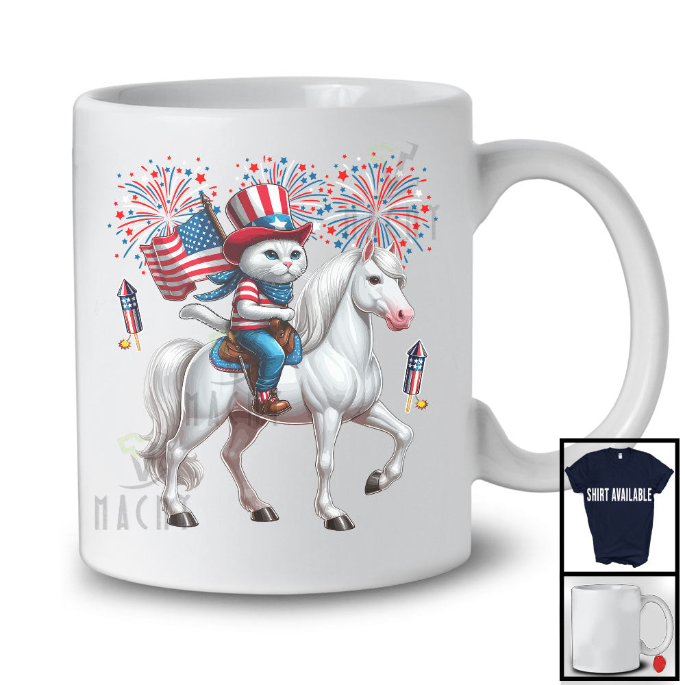 • Cat Riding Horse, Humorous 4th Of July American Flag Pride Cat Horse, Patriotic Group T-Shirt. This cotton t-shirt is a durable staple product with a classic fit. One of the most popular items, it has a relaxed style made for everyday and casual wear.