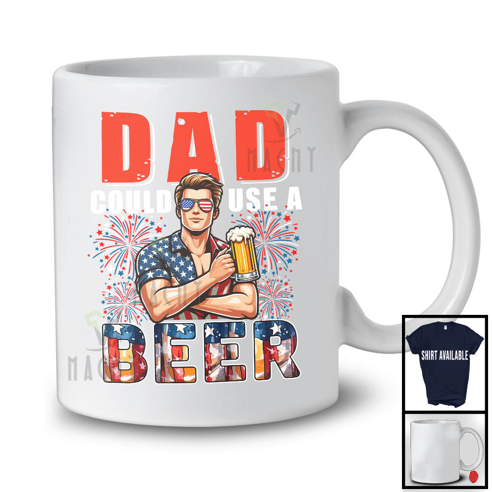 • Dad Could Use A Beer, Awesome 4th Of July Drinking Beer Fireworks, Patriotic Family Group T-Shirt. This cotton t-shirt is a durable staple product with a classic fit. One of the most popular items, it has a relaxed style made for everyday and casual wear.