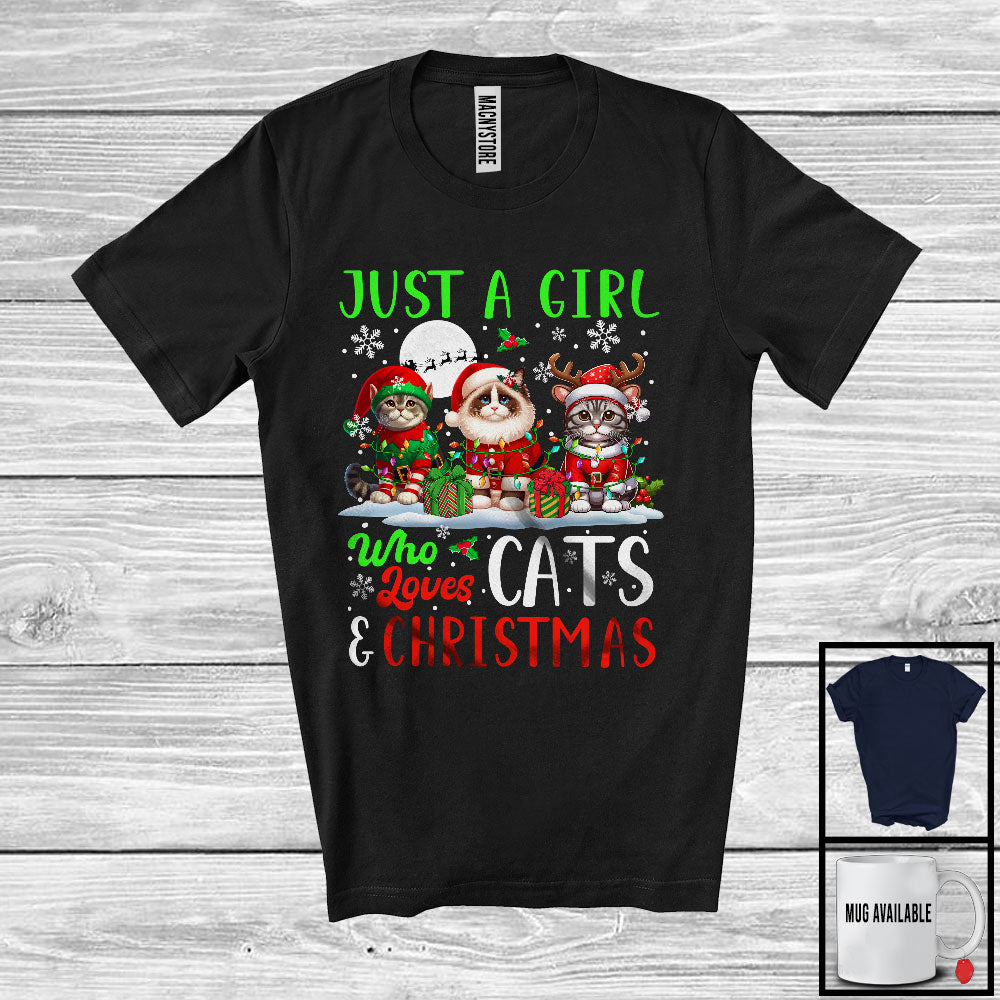 Just A Girl Who Loves Cats And Christmas, Lovely Christmas Lights Snowing Around, Animal Lover T-Shirt. This cotton t-shirt is a durable staple product with a classic fit. One of the most popular items, it has a relaxed style made for everyday and casual wear.