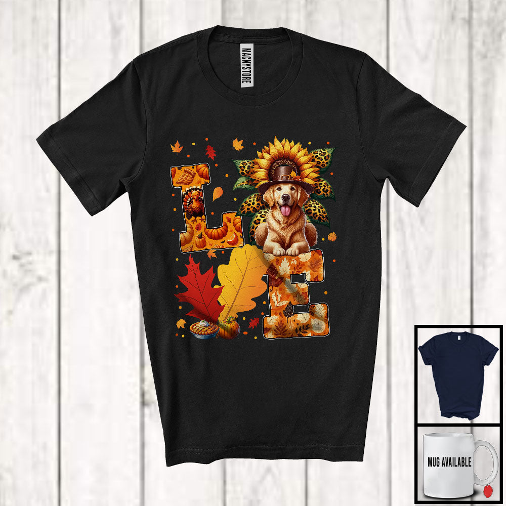 LOVE, Wonderful Thanksgiving Pilgrim Golden Retriever, Leopard Sunflower Pumpkins T-Shirt