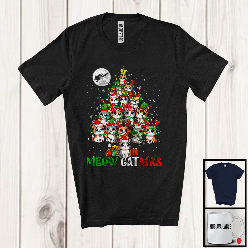 Meow Catmas; Adorable Christmas Tree Lights Santa Cat Owner; Snowing Around Family Group T-Shirt. This cotton t-shirt is a durable staple product with a classic fit. One of the most popular items, it has a relaxed style made for everyday and casual wear.