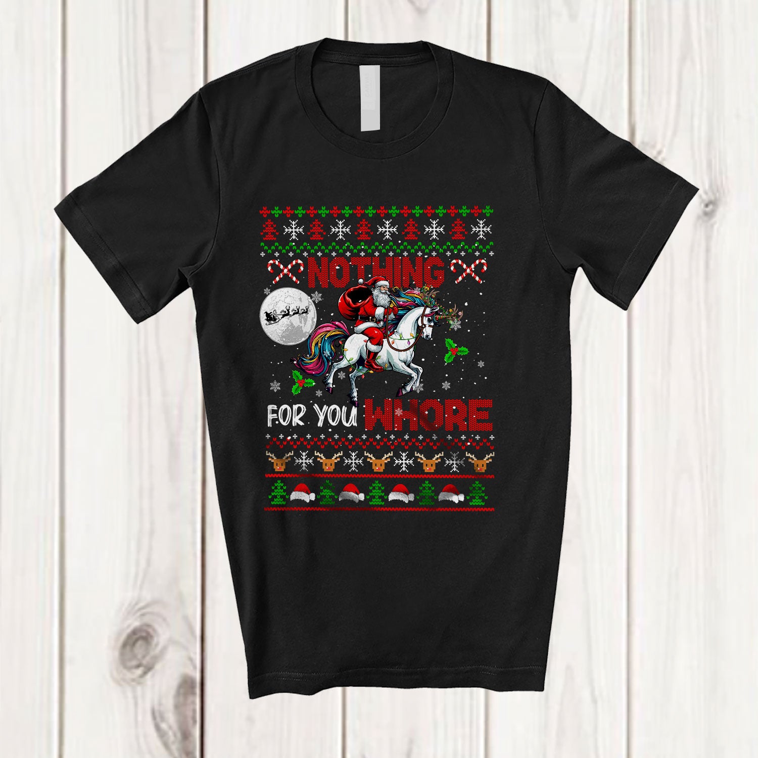 Nothing For You Whore; Sarcastic Christmas Santa Riding Unicorn; Naughty Sweater Family T-Shirt. This cotton t-shirt is a durable staple product with a classic fit. One of the most popular items, it has a relaxed style made for everyday and casual wear.