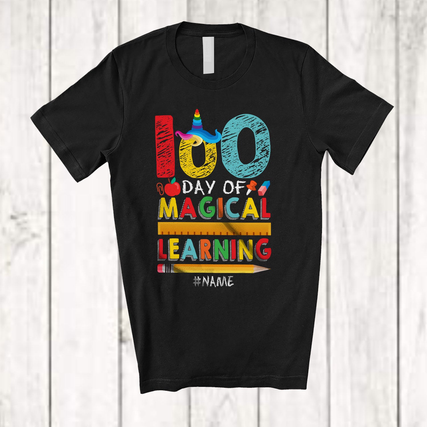 Personalized 100 Days of Magical Learning; Adorable School Unicorn; Custom Name Boy Student T-Shirt. This cotton t-shirt is a durable staple product with a classic fit. One of the most popular items, it has a relaxed style made for everyday and casual wear.