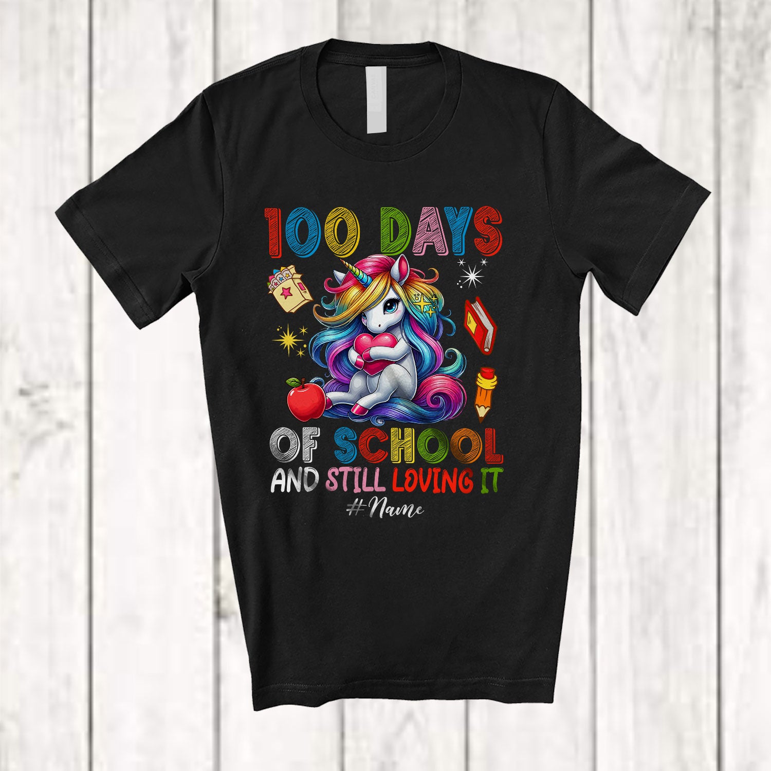 Personalized 100 Days of School And Still Loving It; Awesome Custom Name Unicorn Holding Heart T-Shirt