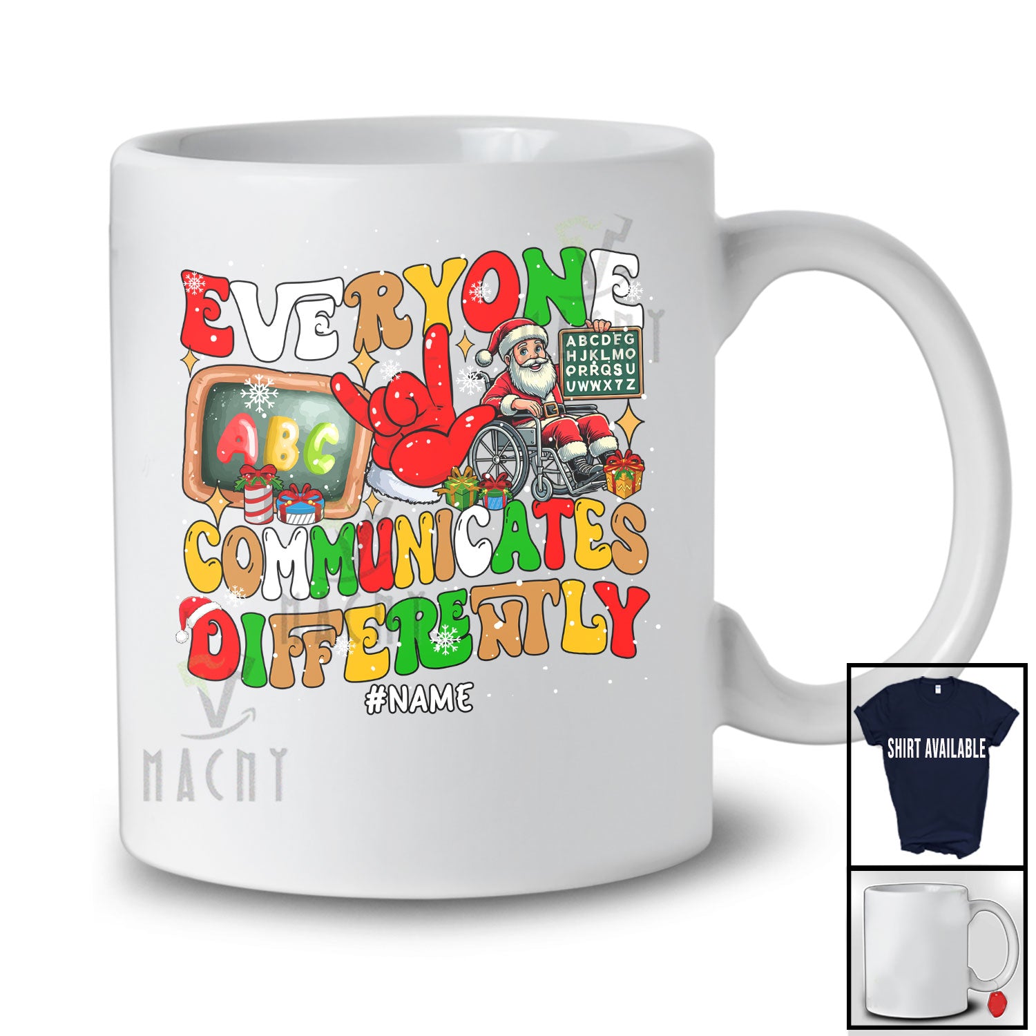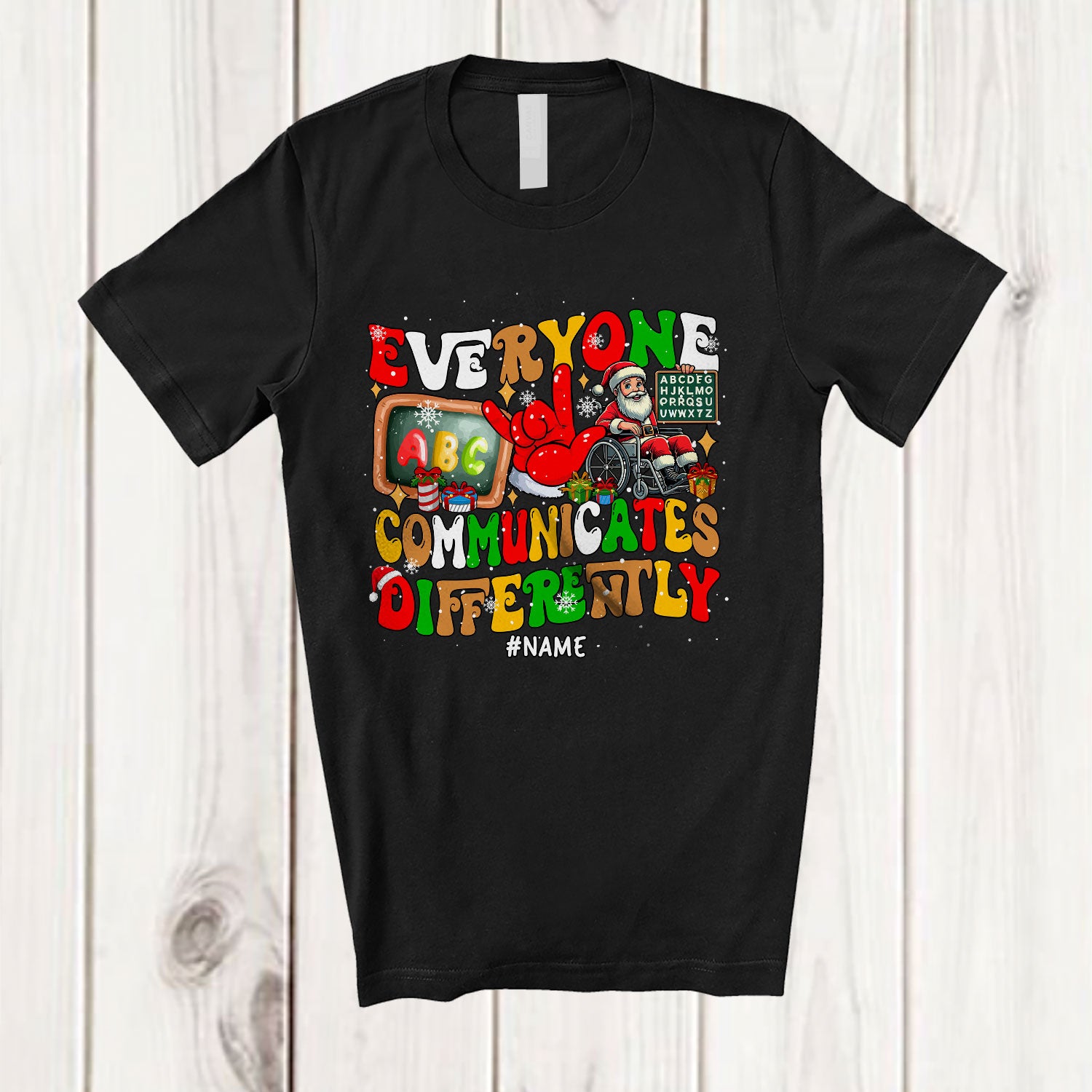 Personalized Communicates Differently; Joyful Christmas Santa; Custom Name Speech Therapy T-Shirt. This cotton t-shirt is a durable staple product with a classic fit. One of the most popular items, it has a relaxed style made for everyday and casual wear.
