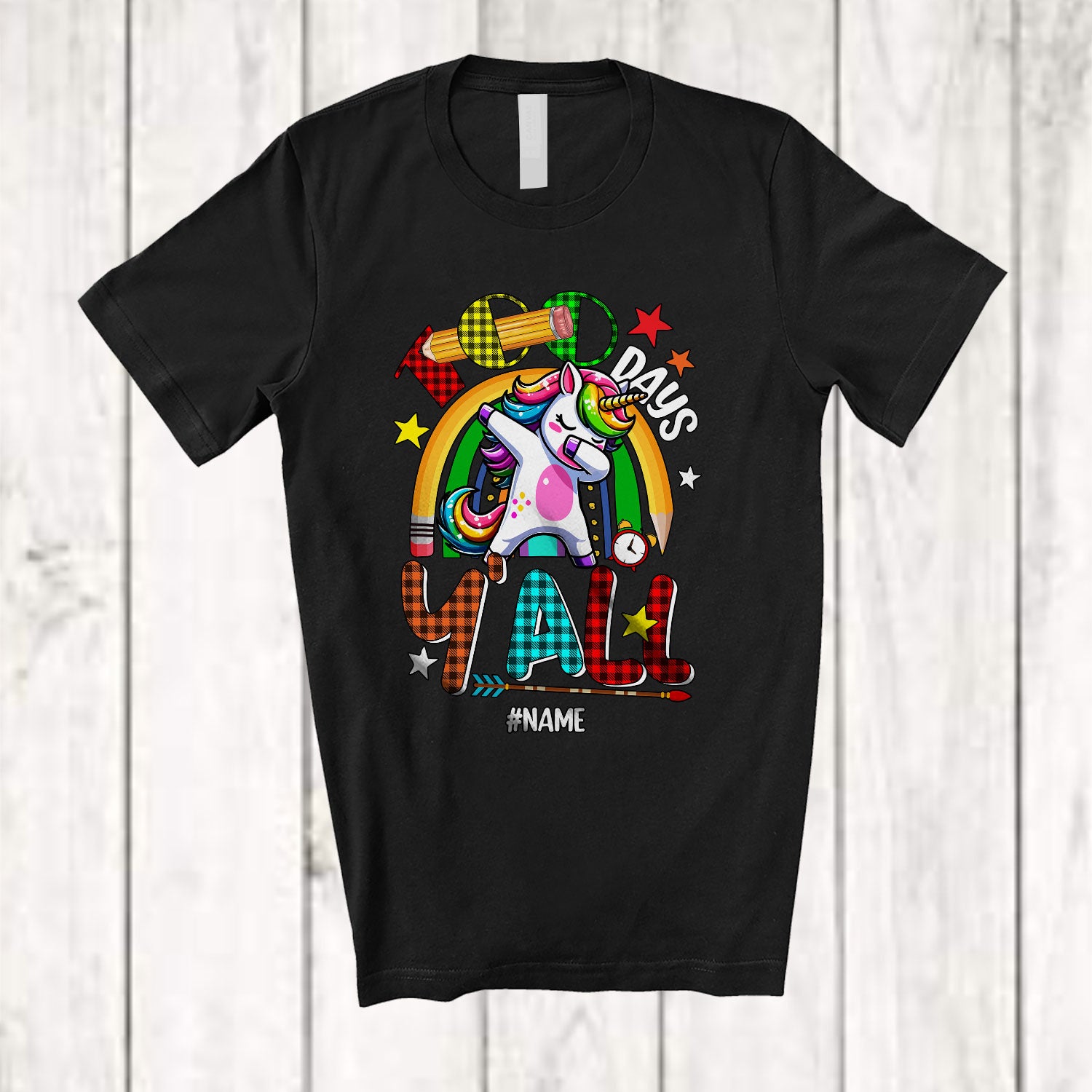 Personalized Custom Name 100 Days Y'all; Wonderful 100th Day Of School Dabbing Unicorn; Plaid Rainbow T-Shirt. This cotton t-shirt is a durable staple product with a classic fit. One of the most popular items, it has a relaxed style made for everyday and casual wear.