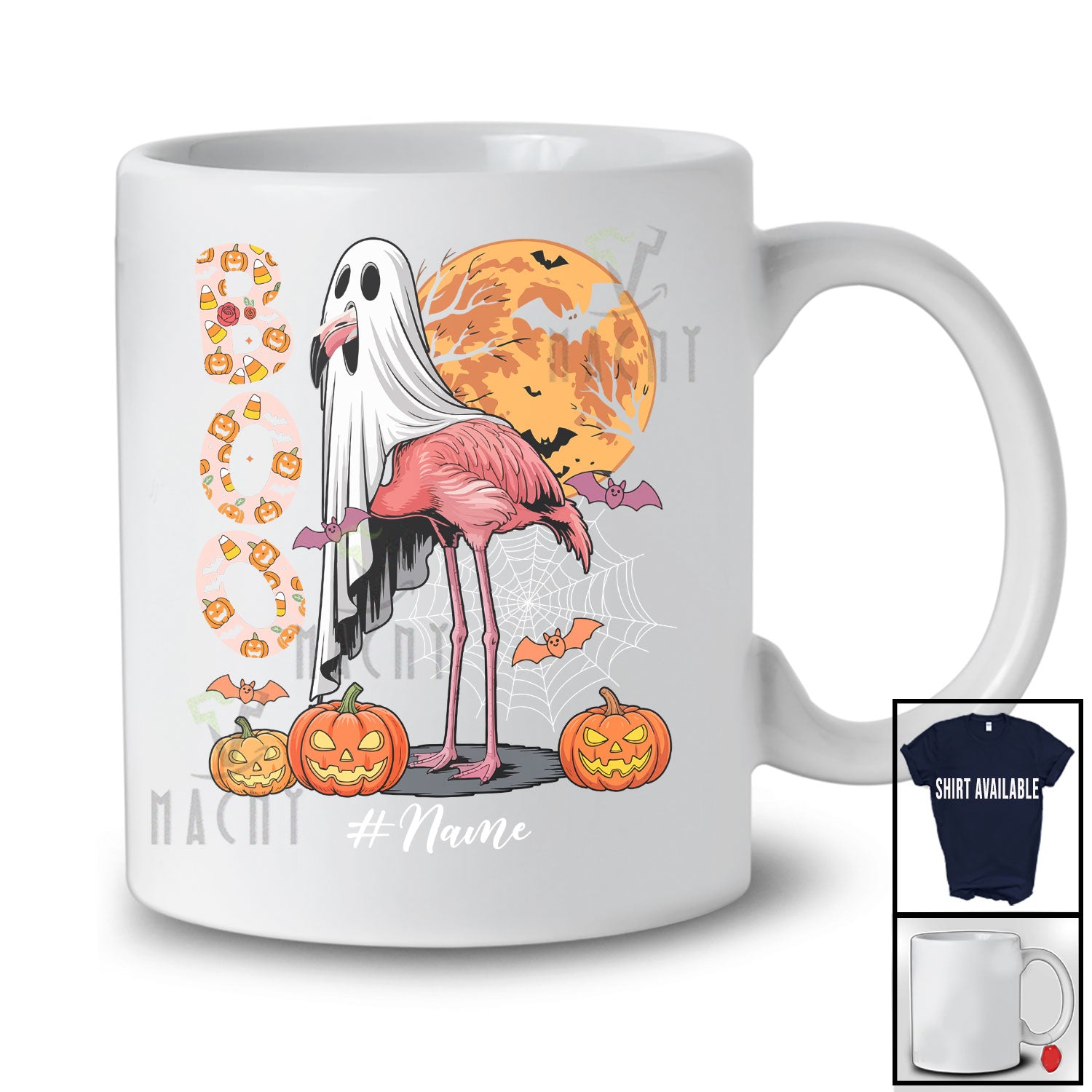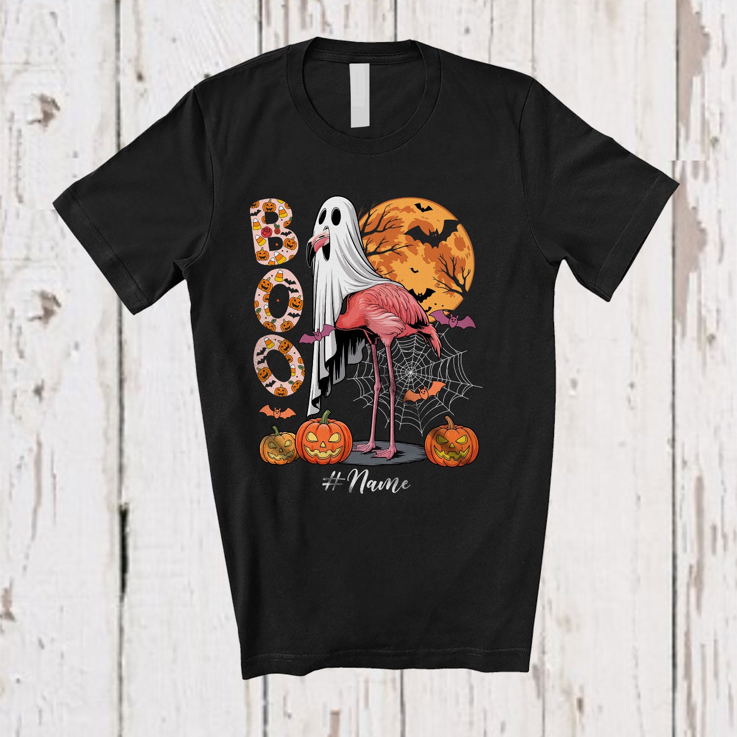 Personalized Custom Name BOO; Awesome Halloween Costume Moon Ghost Flamingo Animal T-Shirt. This cotton t-shirt is a durable staple product with a classic fit. One of the most popular items, it has a relaxed style made for everyday and casual wear.