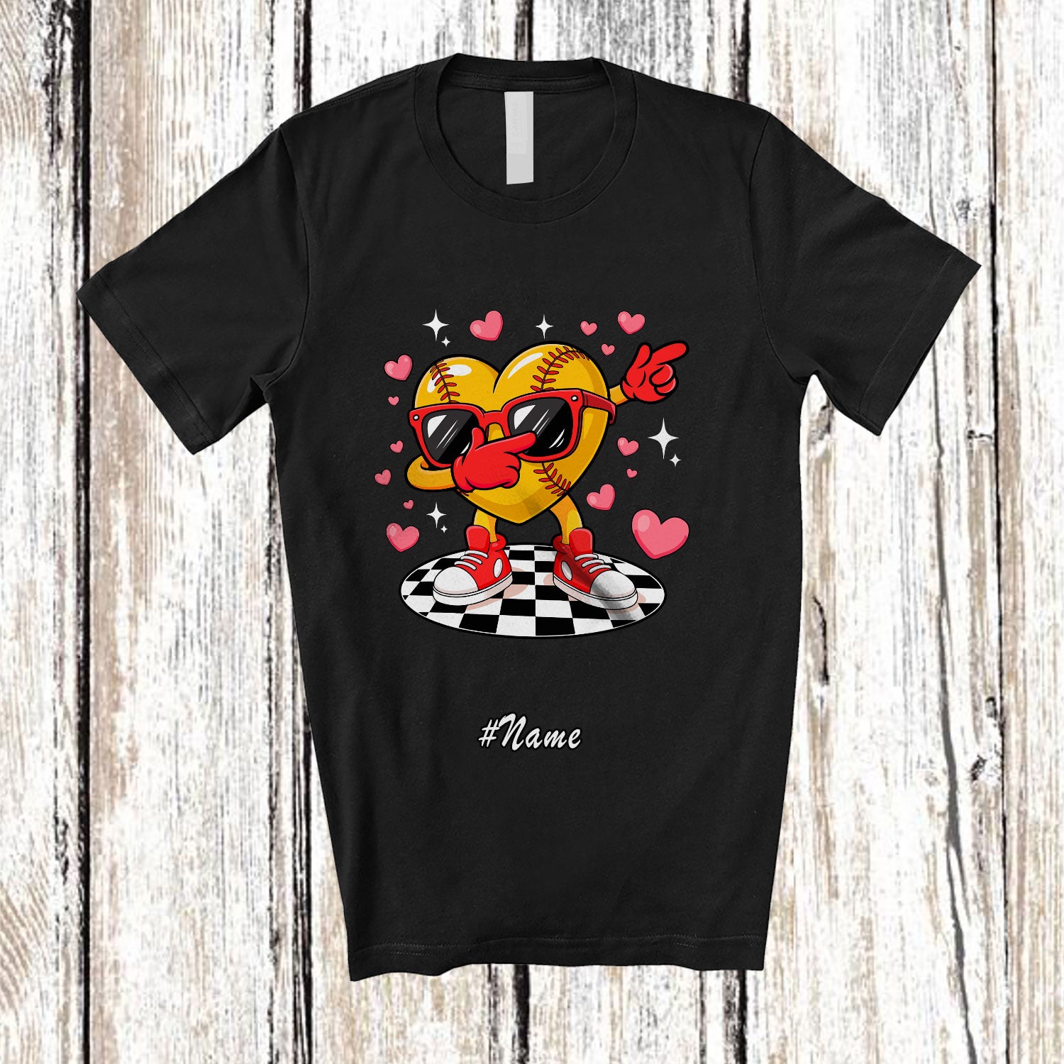 • Personalized Custom Name Dabbing Heart Sunglasses Softball; Joyful Valentine Sport Player Team T-Shirt. This cotton t-shirt is a durable staple product with a classic fit. One of the most popular items, it has a relaxed style made for everyday and casual wear.